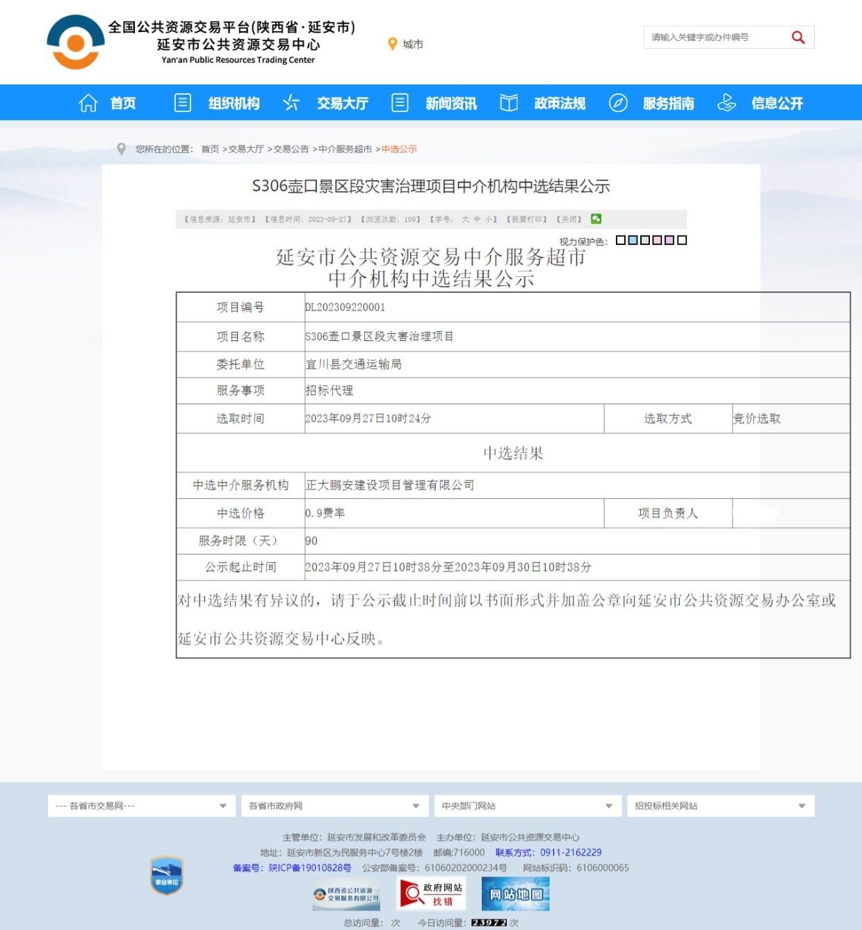 2023年9月27日,正大鵬安建設(shè)項(xiàng)目管理有限公司在延安市公共資源交易中心中介服務(wù)超市機(jī)構(gòu)中選S306壺口景區(qū)段災(zāi)害治理項(xiàng)目。
