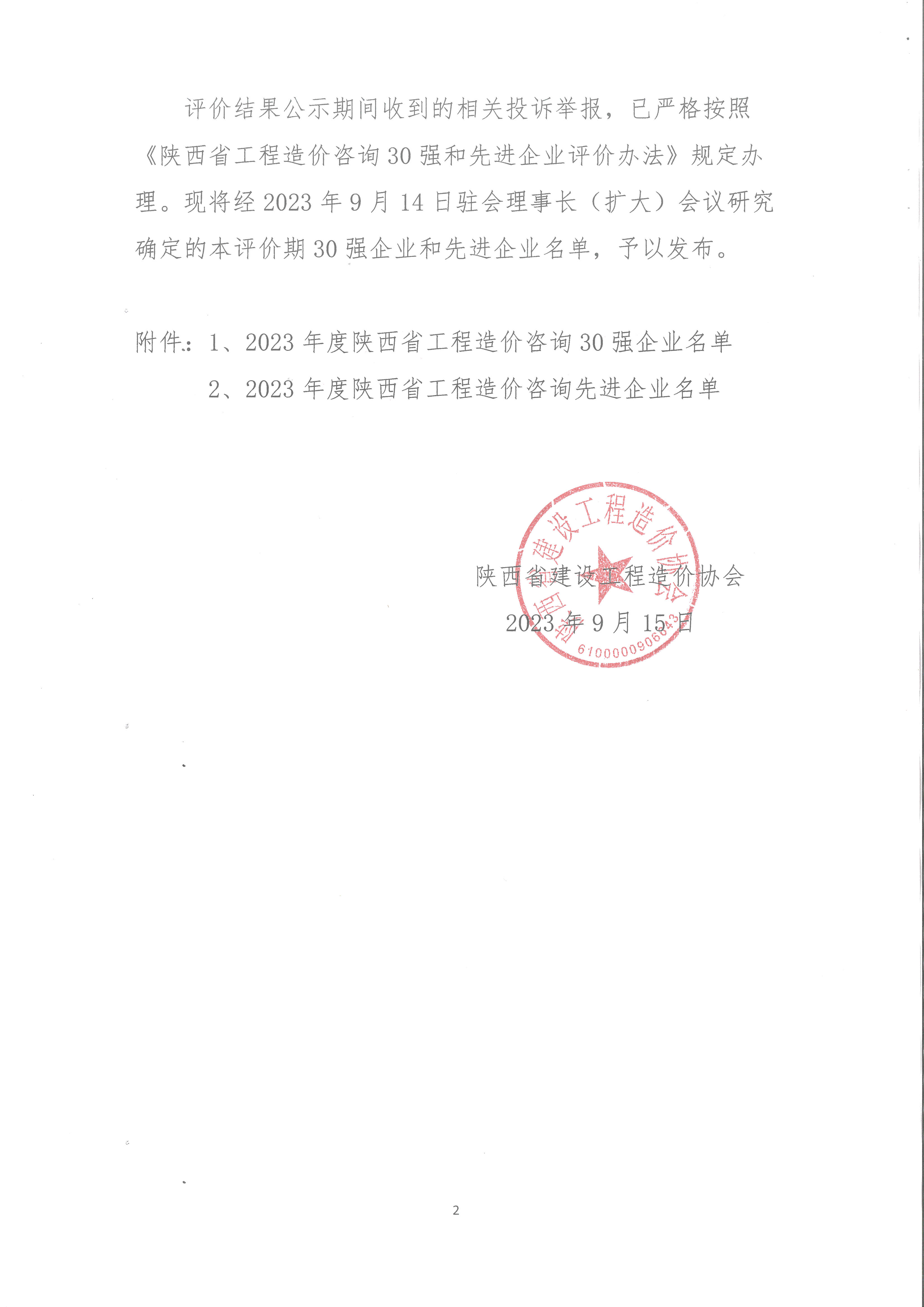 2023年9月15日,經(jīng)陜西省建設(shè)工程造價管理協(xié)會審議通過并公示,正大鵬安榮獲“陜西省工程造價咨詢30強(qiáng)企業(yè)”稱號。