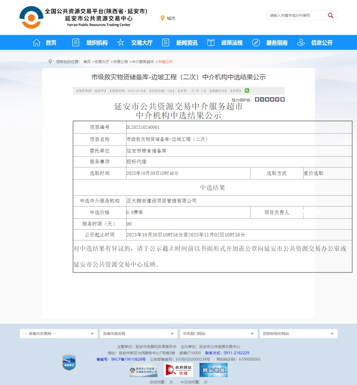 2023年10月30日,正大鵬安建設(shè)項目管理有限公司在延安市公共資源交易中心中介服務(wù)超市機構(gòu)中選市級救災(zāi)物資儲備庫-邊坡工程(二次)項目。
