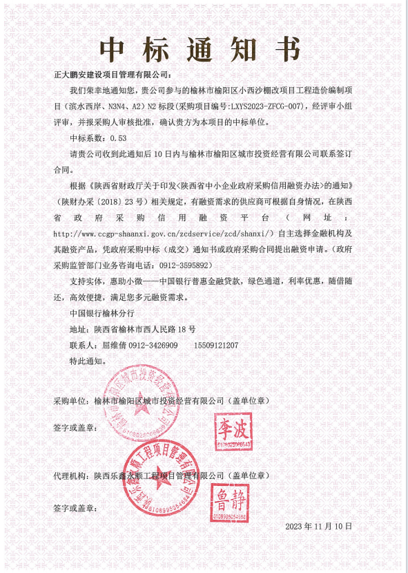 2023年11月,經(jīng)評標(biāo)委員會評定,招標(biāo)人確認(rèn),正大鵬安建設(shè)項目管理有限公司中標(biāo)“榆林市榆陽區(qū)小西沙棚改項目工程造價編制項目(濱水西岸、 N3N4、A2)N2 標(biāo)段”。