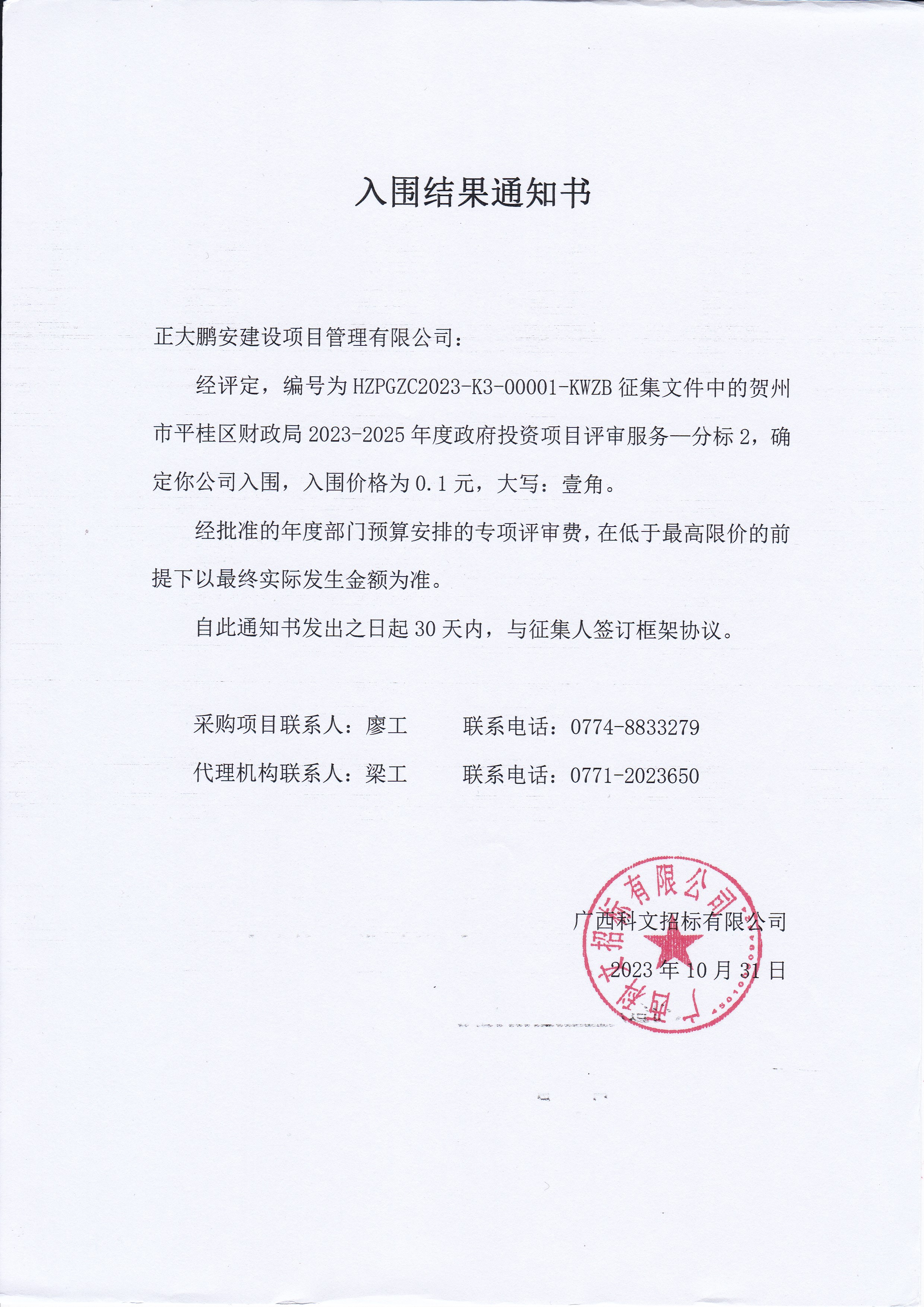 2023年11月,經(jīng)評標(biāo)委員會評定,招標(biāo)人確認(rèn),正大鵬安建設(shè)項目管理有限公司中標(biāo)“賀州市平桂區(qū)財政局2023-2025年度政府投資項目評審服務(wù)一分標(biāo)2”。