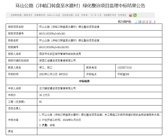2023年11月,經(jīng)評標(biāo)委員會評定,招標(biāo)人確認(rèn),正大鵬安建設(shè)項(xiàng)目管理有限公司中標(biāo)西安市長安區(qū)城市管理和綜合執(zhí)法局的“環(huán)山公路(灃峪口轉(zhuǎn)盤至水磨村)綠化整治項(xiàng)目監(jiān)理”項(xiàng)目。