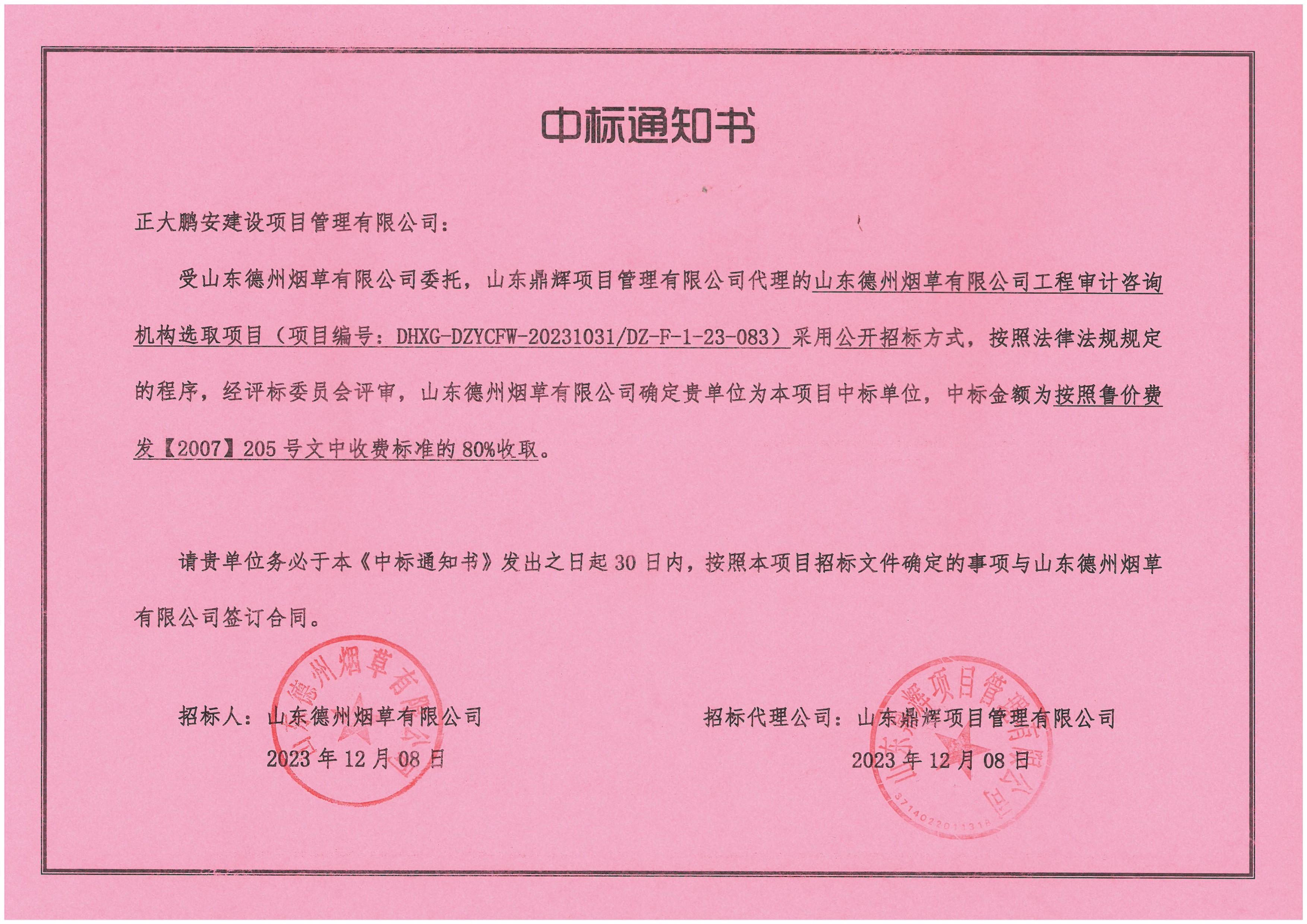 正大鵬安中標(biāo)山東德州煙草有限公司工程審計(jì)咨詢機(jī)構(gòu)選取項(xiàng)目