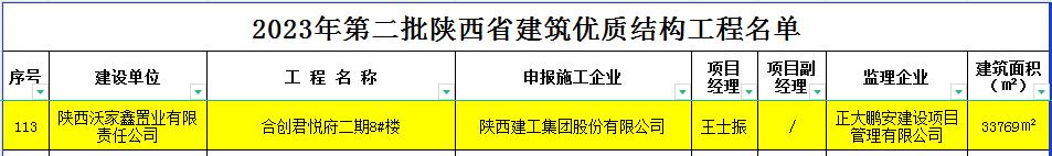 近日,陜西省建筑業(yè)協(xié)會公布2023年第二批陜西省建筑優(yōu)質(zhì)結(jié)構(gòu)工程名單,正大鵬安公司監(jiān)理的合創(chuàng)君悅府二期8#樓獲得“陜西省優(yōu)質(zhì)結(jié)構(gòu)工程”稱號。