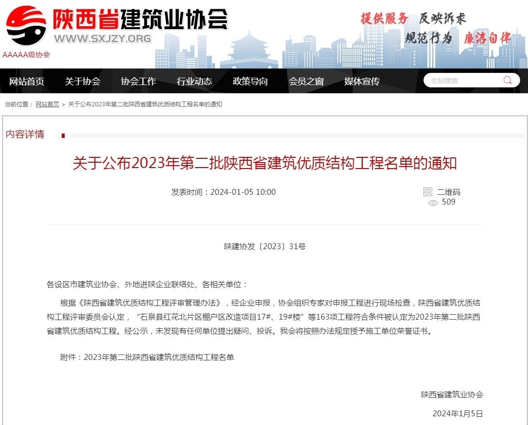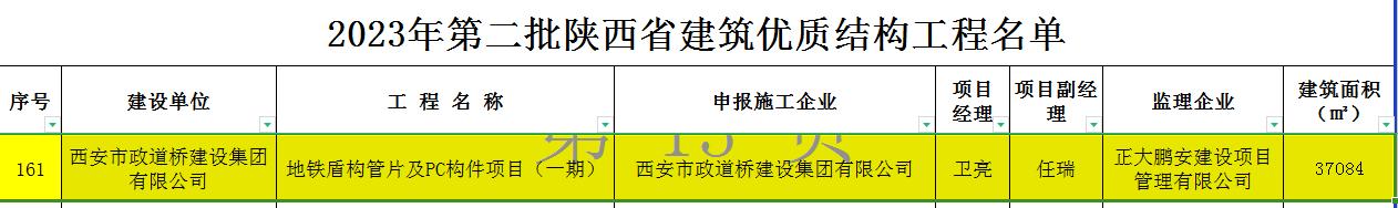 近日,陜西省建筑業(yè)協(xié)會(huì)公布2023年第二批陜西省建筑優(yōu)質(zhì)結(jié)構(gòu)工程名單,正大鵬安公司監(jiān)理的地鐵盾構(gòu)管片及PC構(gòu)件項(xiàng)目(一期)獲得“陜西省優(yōu)質(zhì)結(jié)構(gòu)工程”稱號(hào)。