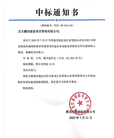 2023年7月,經(jīng)評(píng)標(biāo)委員會(huì)綜合評(píng)審,招標(biāo)人確認(rèn),正大鵬安建設(shè)項(xiàng)目管理有限公司中標(biāo)“黑龍江省筆架山農(nóng)場(chǎng)2023年國(guó)家財(cái)政補(bǔ)助高標(biāo)準(zhǔn)農(nóng)田建設(shè)項(xiàng)目”。