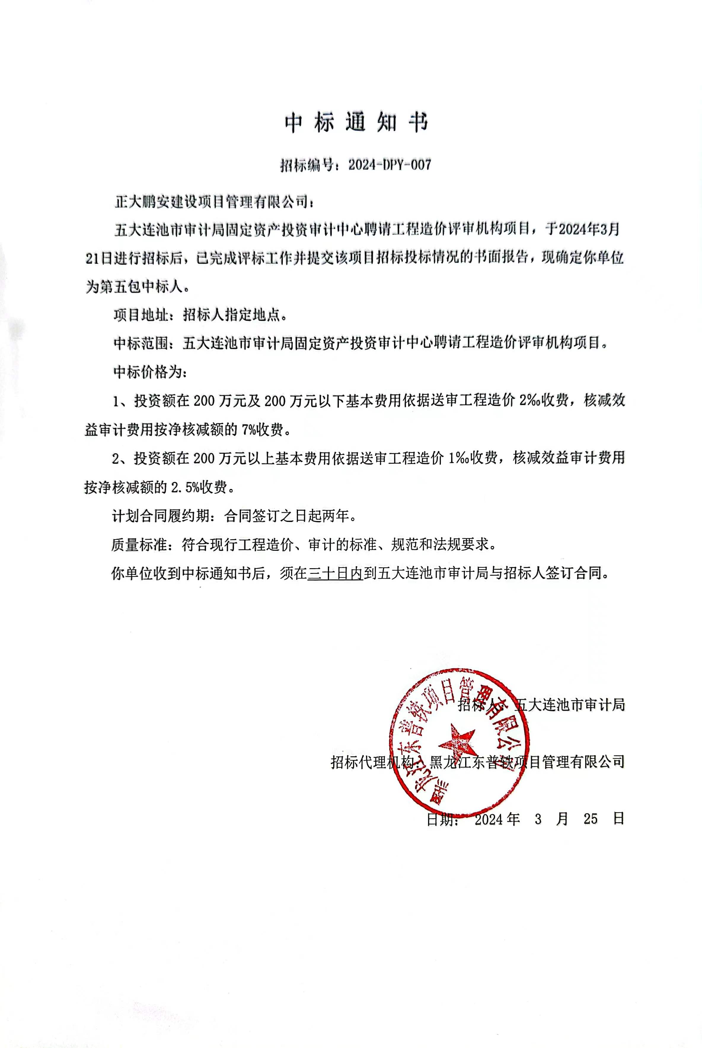 2024年3月,經(jīng)評(píng)標(biāo)委員會(huì)綜合評(píng)審,招標(biāo)人確認(rèn),正大鵬安建設(shè)項(xiàng)目管理有限公司中標(biāo)“五大連池市審計(jì)局固定資產(chǎn)投資審計(jì)中心聘請(qǐng)工程造價(jià)評(píng)審機(jī)構(gòu)項(xiàng)目”。