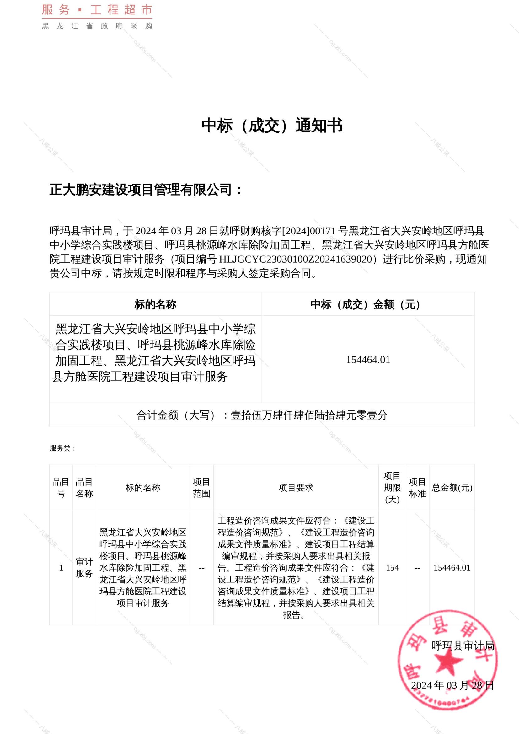 2024年3月,經(jīng)評標委員會綜合評審,招標人確認,正大鵬安建設項目管理有限公司中標“黑龍江省大興安嶺地區(qū)呼瑪縣中小學綜合實踐樓項目、呼瑪縣桃源峰水庫除險加固工程、黑龍江省大興安嶺地區(qū)呼瑪縣方艙醫(yī)院工程建設項目審計服務”。