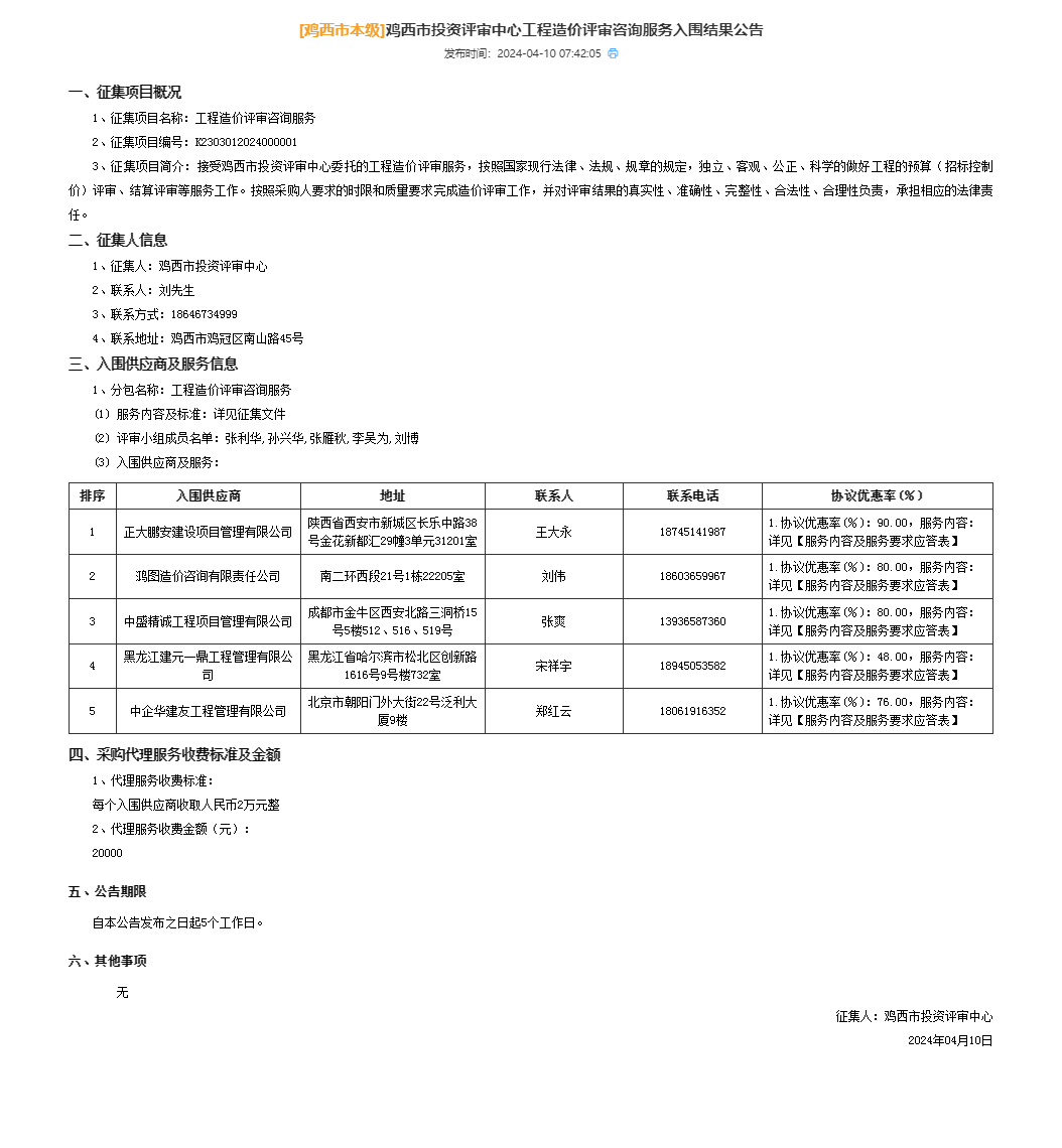 2024年4月10日,經(jīng)評標委員會綜合評審,招標人確認,正大鵬安建設項目管理有限公司中標“雞西市工程造價評審咨詢服務項目”。