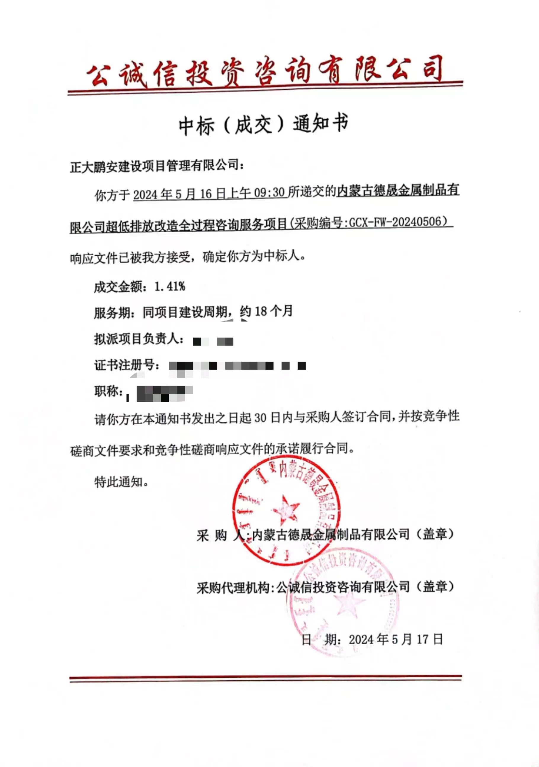 正大鵬安中標(biāo)內(nèi)蒙古德晟金屬制品有限公司超低排放改造全過(guò)程咨詢服務(wù)項(xiàng)目