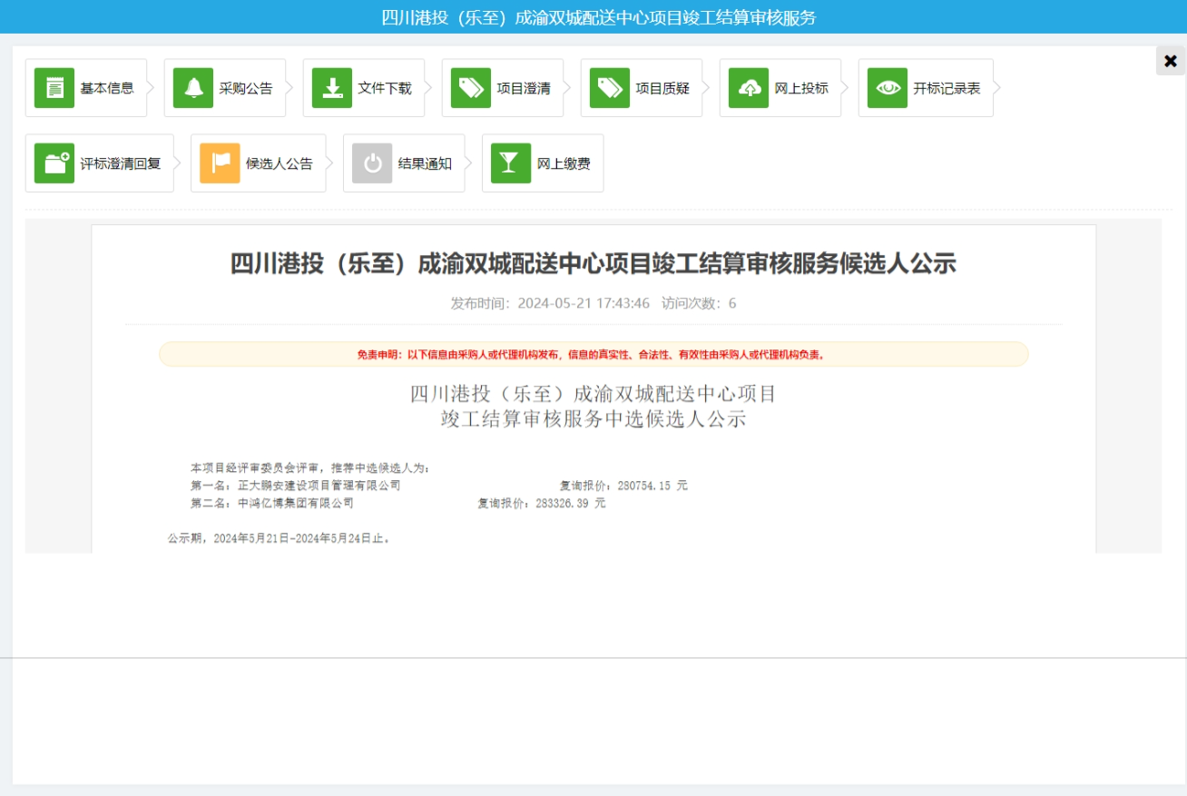 2024年5月21日,經(jīng)評標委員會綜合評審,招標人確認,正大鵬安建設(shè)項目管理有限公司中標“四川港投(樂至)成渝雙城配送中心項目竣工結(jié)算審核服務”。