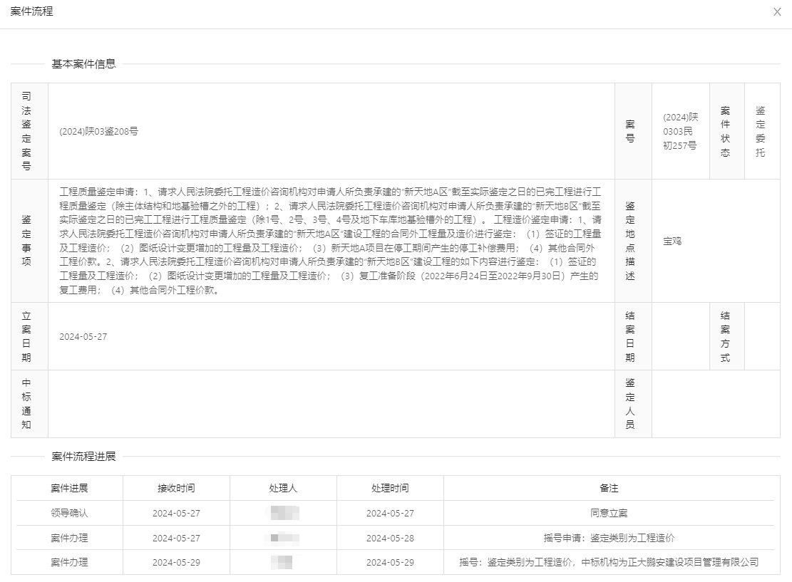 2024年5月27日,經(jīng)寶雞市中級人民法院確認(rèn),正大鵬安建設(shè)項(xiàng)目管理有限公司中標(biāo)“原告中建三局集團(tuán)有限公司與被告陜西東嶺房地產(chǎn)開發(fā)有限公司、東嶺集團(tuán)股份有限公司建設(shè)工程施工合同糾紛一案”司法鑒定項(xiàng)目。