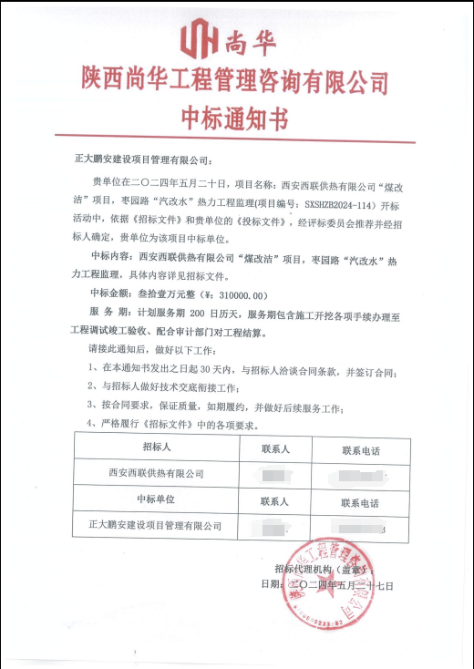 2024年5月20日,經(jīng)評標委員會評定,招標人確認,正大鵬安建設項目管理有限公司中標“西安西聯(lián)供熱有限公司“煤改潔”項目,棗園路“汽改水”熱力工程監(jiān)理項目”。