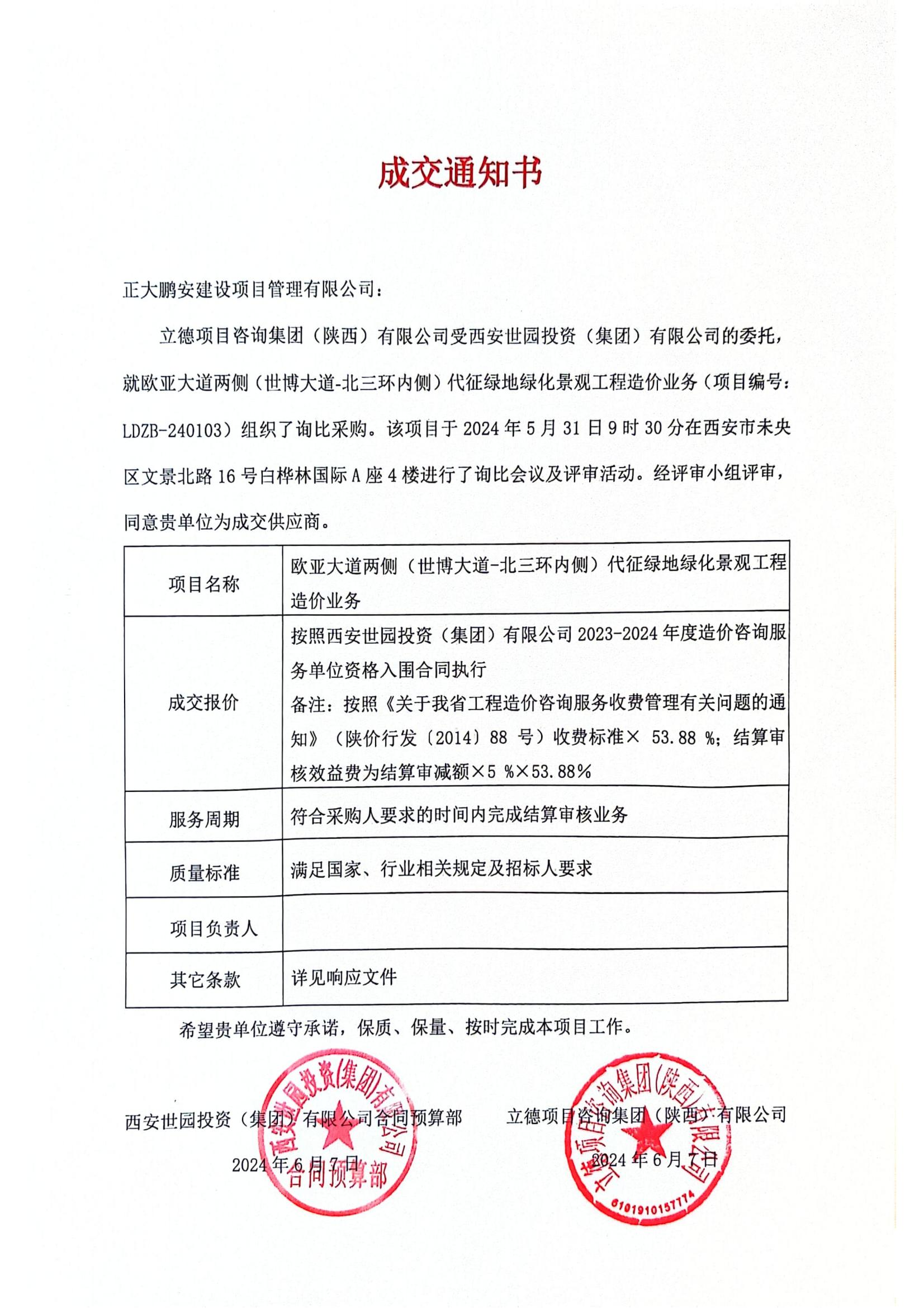 2024年5月31日,經(jīng)評標(biāo)委員會綜合評審,招標(biāo)人確認,正大鵬安建設(shè)項目管理有限公司中標(biāo)“歐亞大道兩側(cè)(世博大道-北三環(huán)內(nèi)側(cè))代征綠地綠化景觀工程造價業(yè)務(wù)”項目。