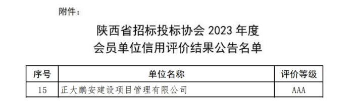 喜報(bào)!正大鵬安公司獲評(píng)陜西省招標(biāo)投標(biāo)協(xié)會(huì)2023年度信用評(píng)價(jià)AAA級(jí)企業(yè)