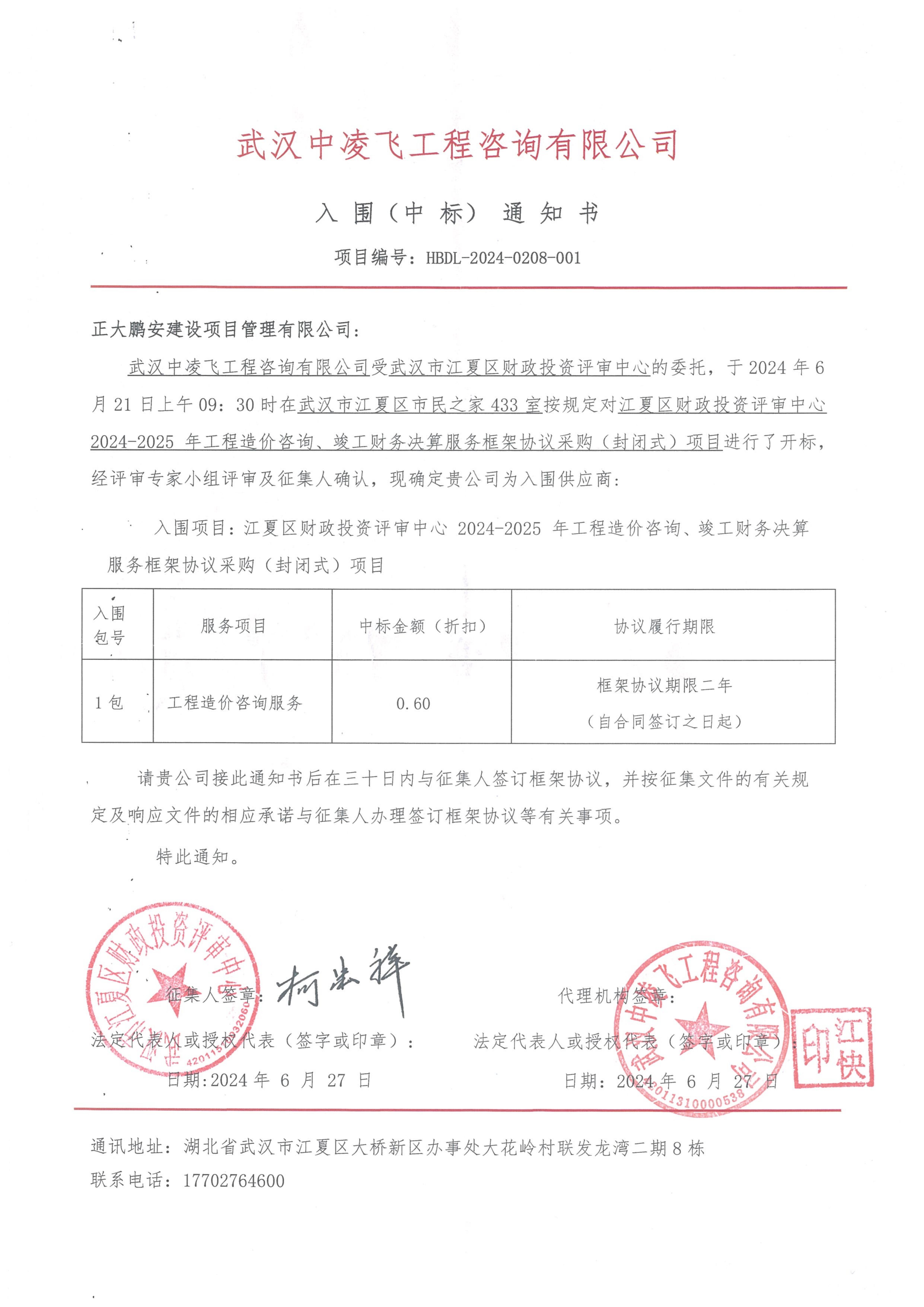 2024年6月24日,經(jīng)評標(biāo)委員會綜合評審,招標(biāo)人確認(rèn),正大鵬安建設(shè)項(xiàng)目管理有限公司入圍“江夏區(qū)財(cái)政投資評審中心 2024-2025 年工程造價(jià)咨詢、竣工財(cái)務(wù)決算服務(wù)框架協(xié)議采購(封閉式)”項(xiàng)目