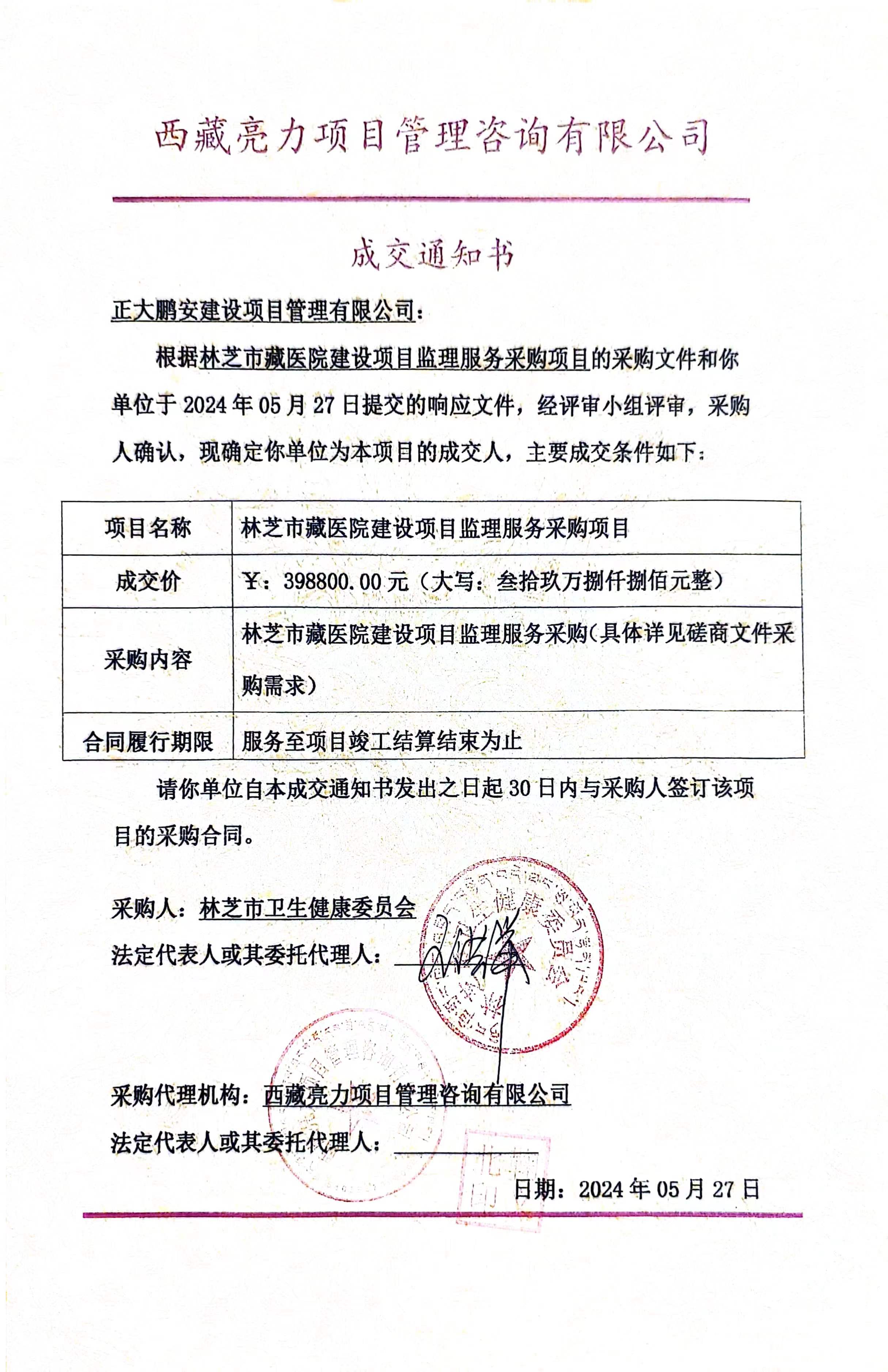2024年5月27日,經(jīng)評(píng)標(biāo)委員會(huì)評(píng)定,招標(biāo)人確認(rèn),正大鵬安建設(shè)項(xiàng)目管理有限公司中標(biāo)“林芝市藏醫(yī)院建設(shè)項(xiàng)目監(jiān)理服務(wù)采購項(xiàng)目”。
