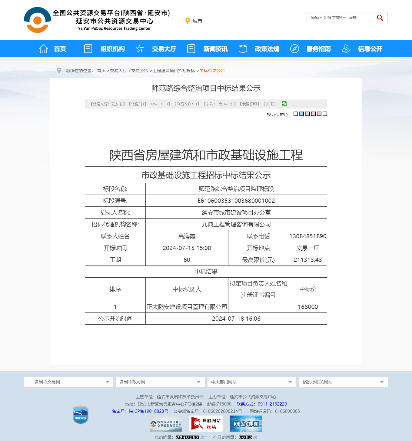 2024年7月15日,經評標委員會綜合評審,招標人確認,正大鵬安建設項目管理有限公司中標師范路綜合整治項目監(jiān)理標段。