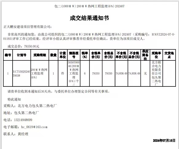 2024年7月16日,經(jīng)評標委員會綜合評審,招標人確認,正大鵬安建設項目管理有限公司中標包二(1000MW)200MW熱網(wǎng)工程監(jiān)理。