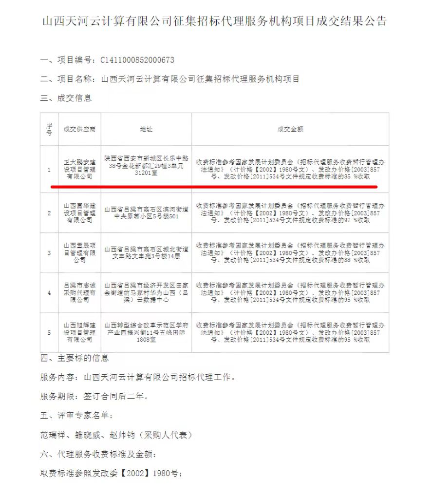 2024年7月22日,經(jīng)評標(biāo)委員會綜合評審,招標(biāo)人確認(rèn),正大鵬安建設(shè)項(xiàng)目管理有限公司中標(biāo)“山西天河云計(jì)算有限公司征集招標(biāo)代理服務(wù)機(jī)構(gòu)項(xiàng)目”。