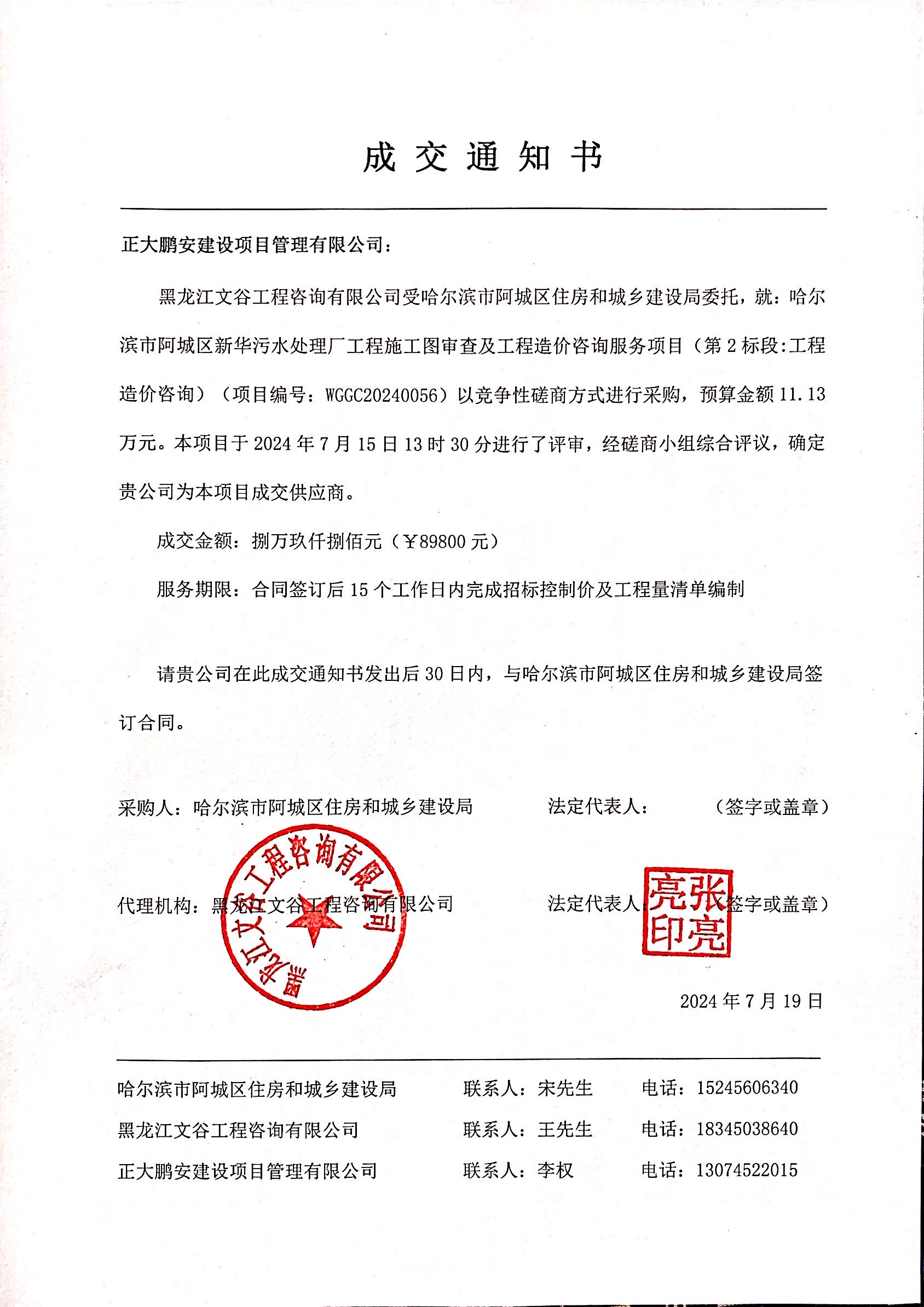 2024年7月15日,經(jīng)評標(biāo)委員會綜合評審,招標(biāo)人確認(rèn),正大鵬安建設(shè)項(xiàng)目管理有限公司中標(biāo)“哈爾濱市阿城區(qū)新華污水處理廠工程施工圖審查及工程造價(jià)咨詢服務(wù)項(xiàng)目(第2標(biāo)段:工程造價(jià)咨詢)”。