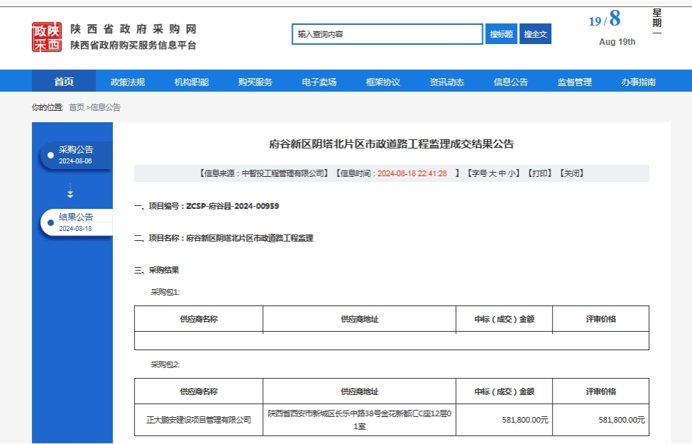 2024年8月19日,經(jīng)評標(biāo)委員會綜合評審,招標(biāo)人確認(rèn),正大鵬安建設(shè)項目管理有限公司中標(biāo)府谷新區(qū)陰塔北片區(qū)市政道路工程監(jiān)理N2標(biāo)段。