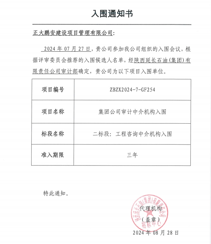 2024年08月28日,經(jīng)評標(biāo)委員會綜合評審,招標(biāo)人確認(rèn),正大鵬安建設(shè)項目管理有限公司中標(biāo)“集團(tuán)公司審計中介機(jī)構(gòu)入圍項目”。