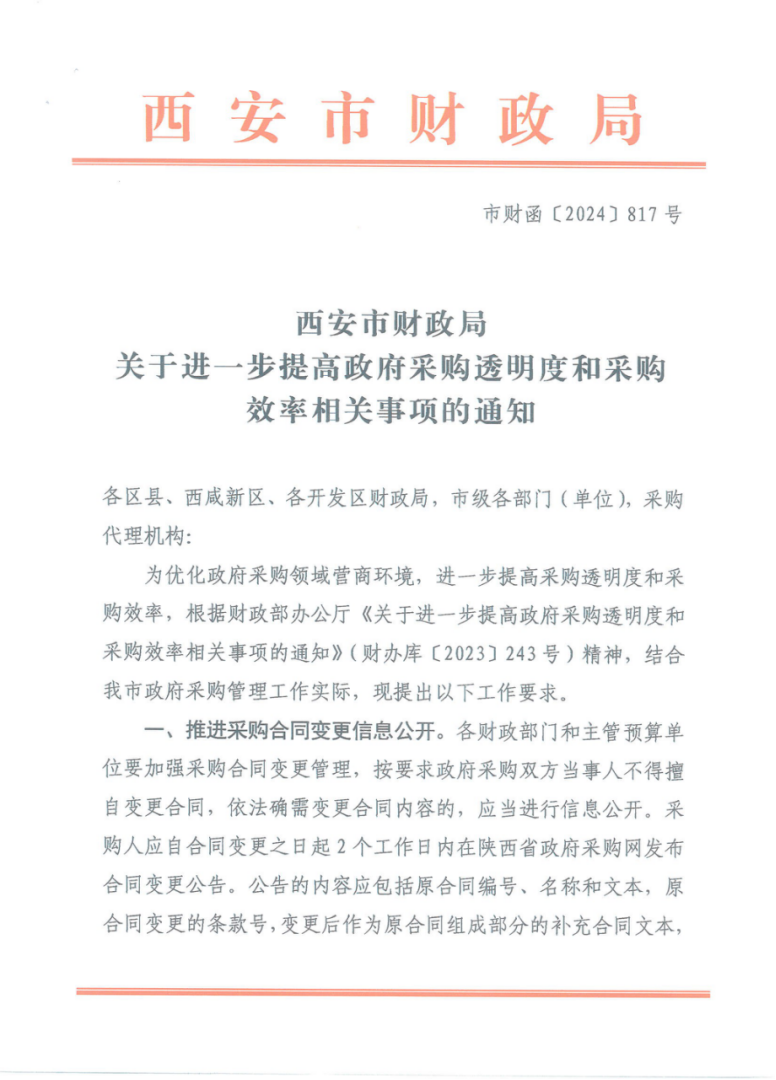西安市財政局關(guān)于進(jìn)一步提高政府采購?fù)该鞫群筒少徯氏嚓P(guān)事項的通知