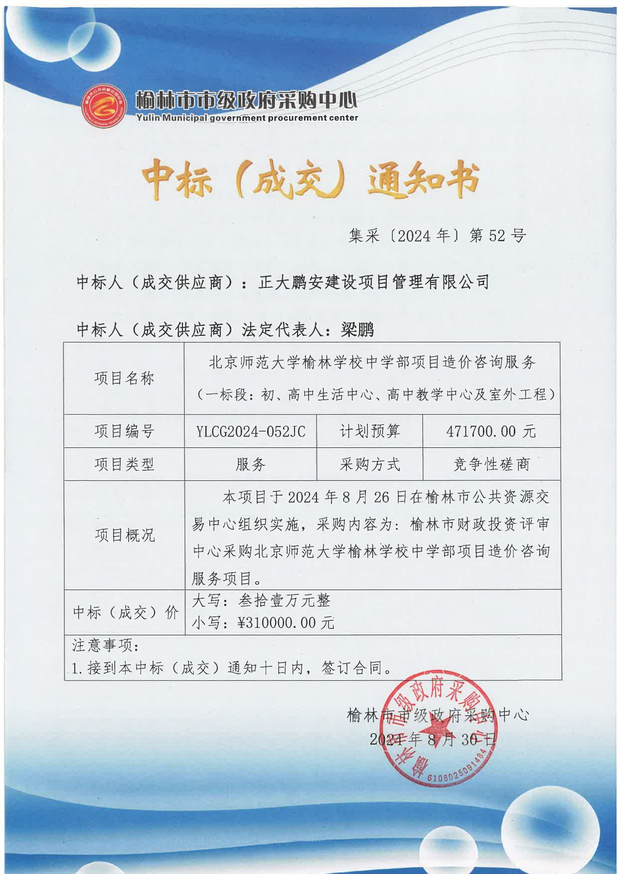 2024年8月26日,經(jīng)評(píng)標(biāo)委員會(huì)綜合評(píng)審,招標(biāo)人確認(rèn),正大鵬安建設(shè)項(xiàng)目管理有限公司中標(biāo)"北京師范大學(xué)榆林學(xué)校中學(xué)部項(xiàng)目造價(jià)咨詢服務(wù)(一標(biāo)段初、高中生活中心、高中教學(xué)中心及室外工程)"。