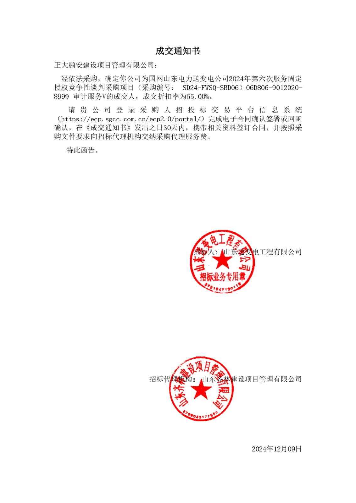 2024年12月9日,經(jīng)評標(biāo)委員會綜合評審,招標(biāo)人確認(rèn),正大鵬安建設(shè)項目管理有限公司中標(biāo)“國網(wǎng)山東電力送變電公司2024年第六次服務(wù)固定授權(quán)競爭性談判采購項目(采購編號:SD24-FWSQ-SBD06)06D806-9012020-8999 審計服務(wù)V”。