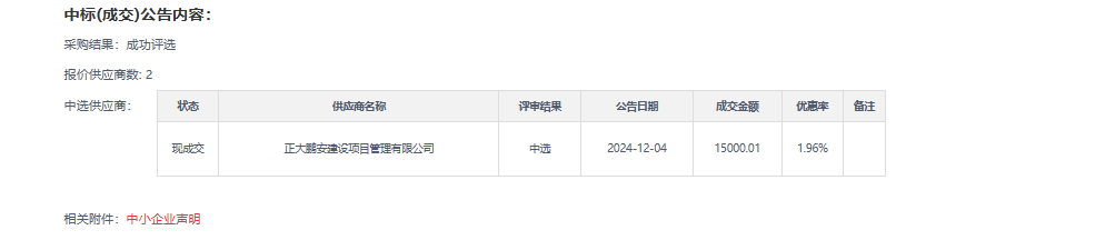 2024年12月11日,經(jīng)評(píng)標(biāo)委員會(huì)綜合評(píng)審,招標(biāo)人確認(rèn),正大鵬安建設(shè)項(xiàng)目管理有限公司中標(biāo)嘉蔭縣農(nóng)村公路建設(shè)工程指揮部2022年農(nóng)村公路危橋改造項(xiàng)目竣工結(jié)算審核服務(wù)項(xiàng)目。