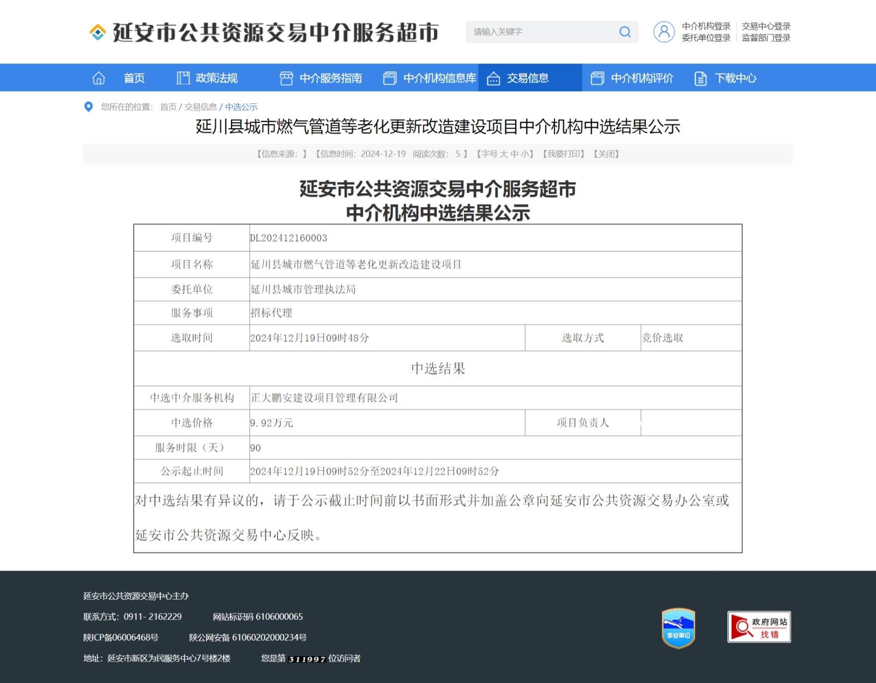 2024年12月19日,正大鵬安建設項目管理有限公司在延安市公共資源交易中心中介服務超市機構(gòu)中選延川縣城市燃氣管道等老化更新改造建設項目招標代理。