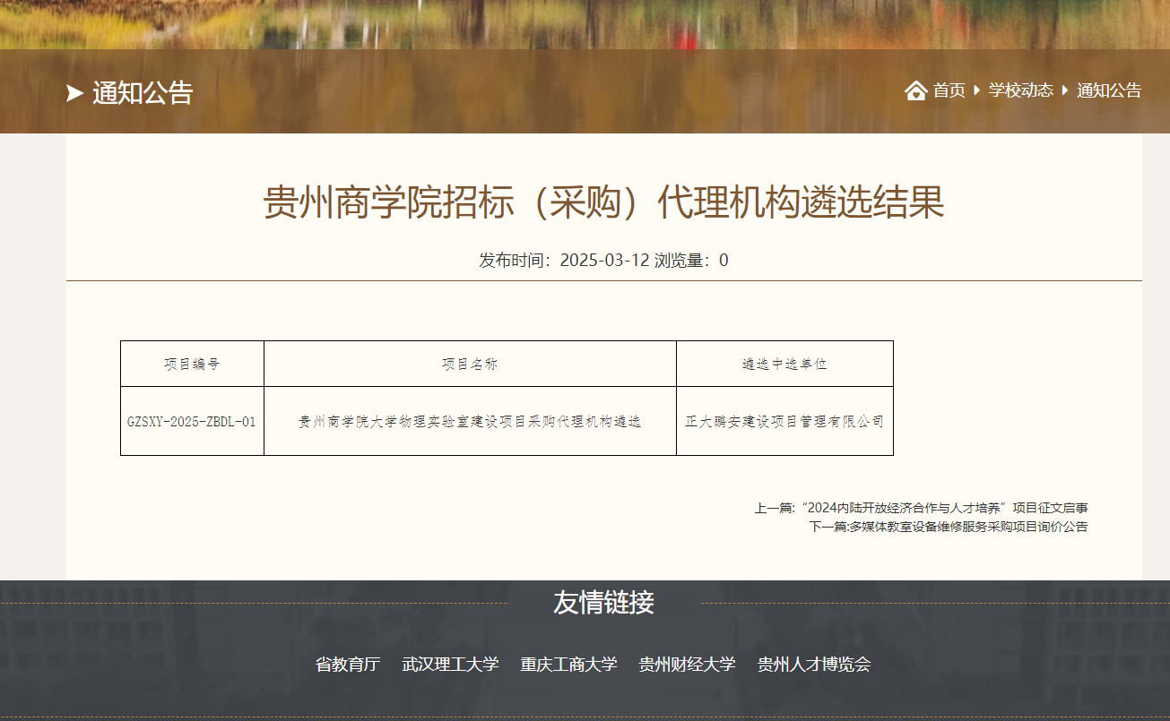 2025年3月12日,經(jīng)評(píng)標(biāo)委員會(huì)綜合評(píng)審,招標(biāo)人確認(rèn),正大鵬安公司中選貴州商學(xué)院大學(xué)物理實(shí)驗(yàn)室建設(shè)項(xiàng)目采購代理機(jī)構(gòu)遴選。