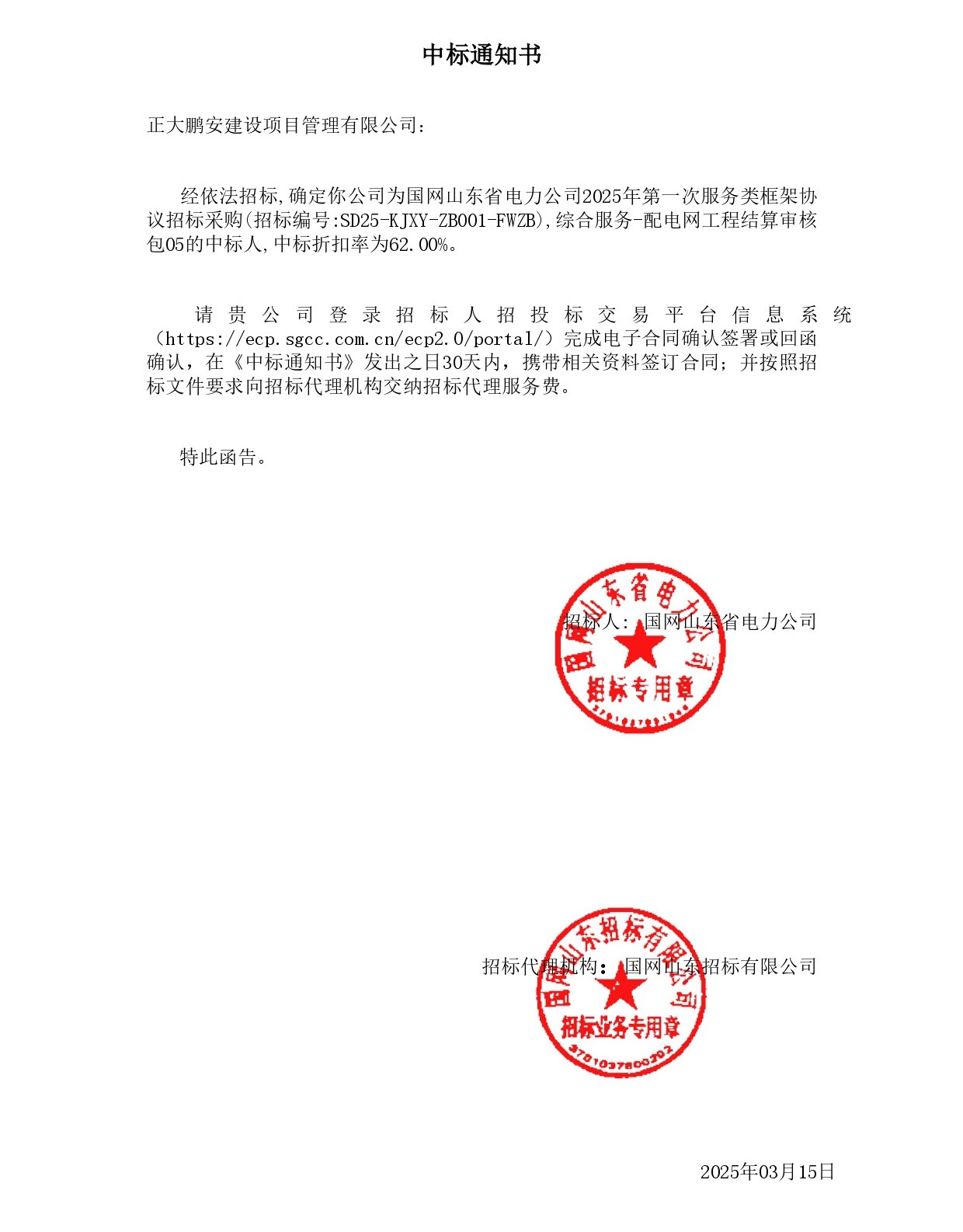 2025年3月15日,經(jīng)評(píng)標(biāo)委員會(huì)綜合評(píng)審,招標(biāo)人確認(rèn),正大鵬安建設(shè)項(xiàng)目管理有限公司中標(biāo)“國(guó)網(wǎng)山東省電力公司2025年第一次服務(wù)類框架協(xié)議招標(biāo)采購(gòu)(招標(biāo)編號(hào):SD25-KJXY-ZB001-FWZB)綜合服務(wù)-配電網(wǎng)工程結(jié)算審核包05”