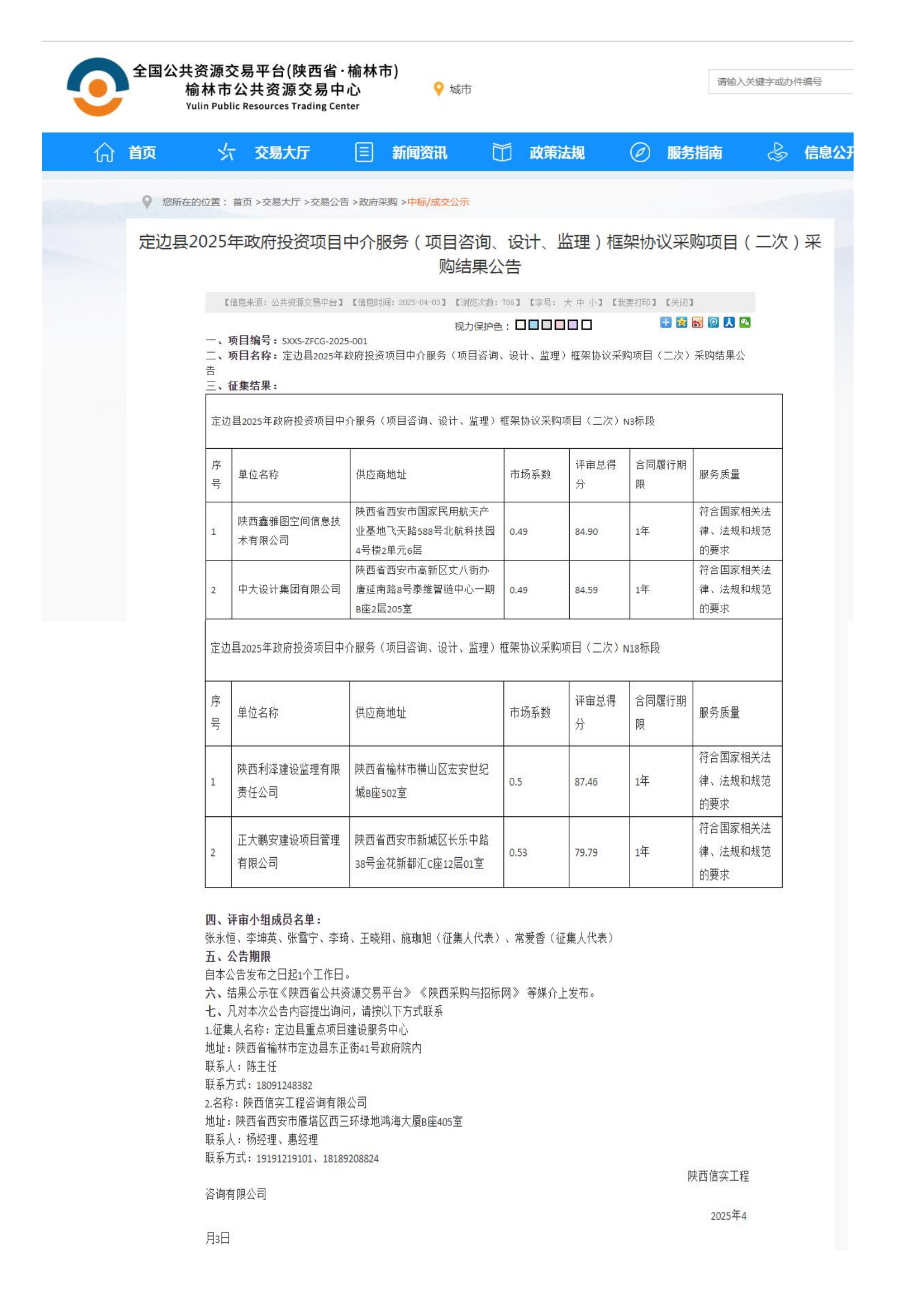2025年4月3日,經(jīng)評標(biāo)委員會綜合評審,招標(biāo)人確認,正大鵬安中標(biāo)定邊縣2025年政府投資項目中介服務(wù)(項目咨詢、設(shè)計、監(jiān)理)框架協(xié)議采購項目(二次)N18標(biāo)段。