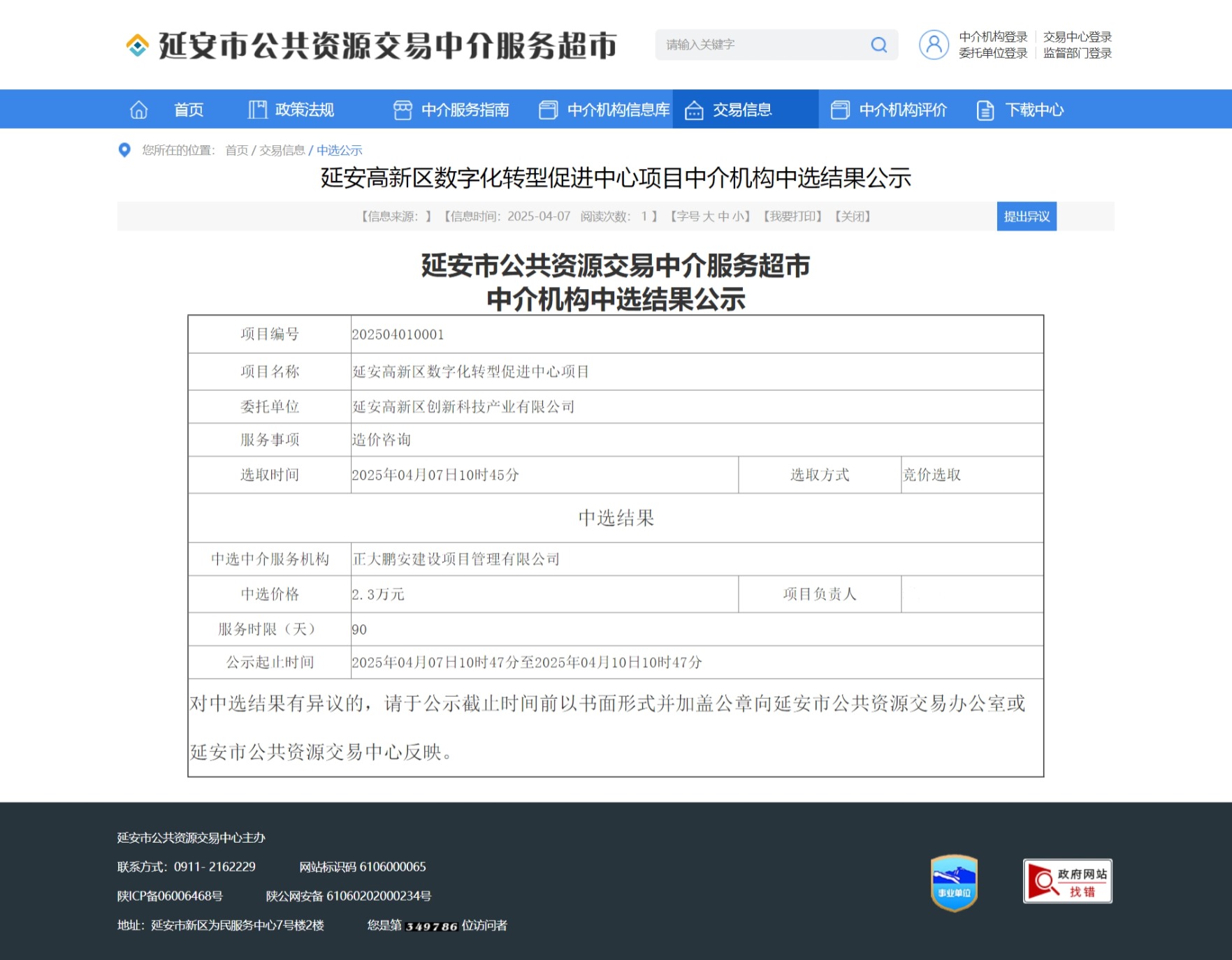 2025年4月7日,正大鵬安建設項目管理有限公司在延安市公共資源交易中心中介服務超市機構(gòu)中選延安高新區(qū)數(shù)字化轉(zhuǎn)型促進中心項目造價咨詢。