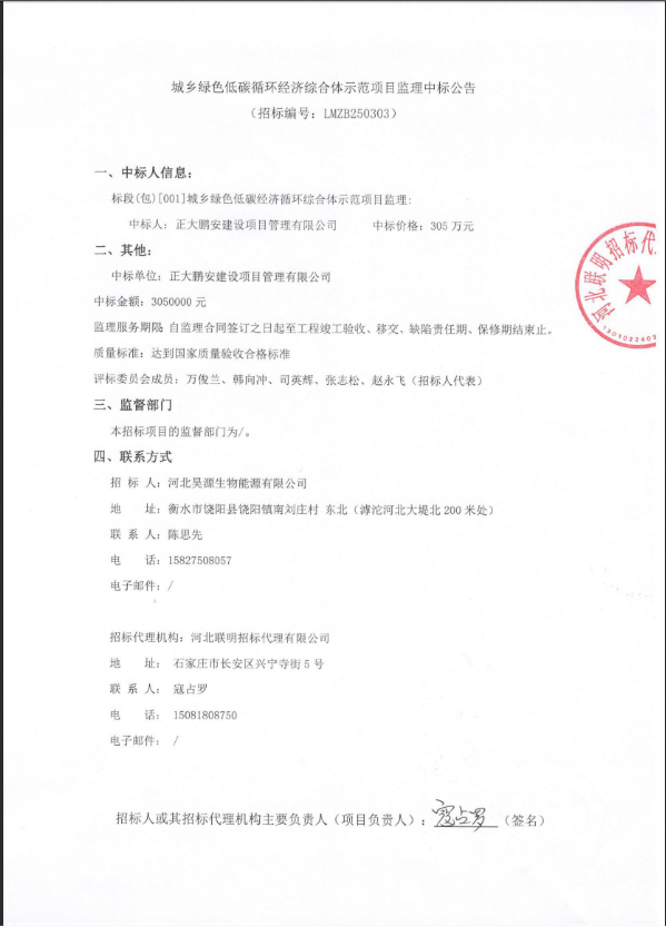 2025年4月10日,經(jīng)評標(biāo)委員會綜合評審,招標(biāo)人確認(rèn),正大鵬安中標(biāo)河北省衡水市城鄉(xiāng)綠色低碳循環(huán)經(jīng)濟(jì)綜合體示范項目監(jiān)理。