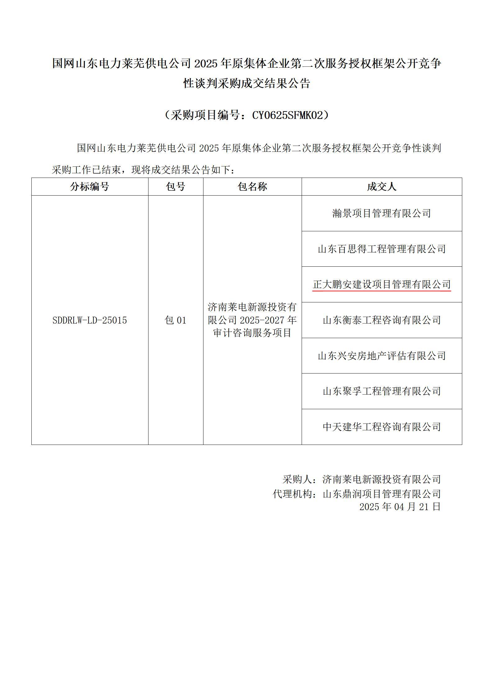 2025年4月21日,經(jīng)評標(biāo)委員會綜合評審,招標(biāo)人確認(rèn),正大鵬安建設(shè)項目管理有限公司中標(biāo)國網(wǎng)山東電力萊蕪供電公司2025年原集體企業(yè)第二次服務(wù)授權(quán)框架公開競爭性談判采購(項目編號:CY0625SFMK02)濟南萊電新源投資有限公司2025-2027年審計咨詢服務(wù)項目包01。