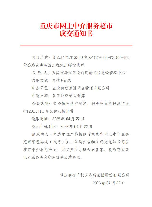 2025年4月22日,經(jīng)評(píng)標(biāo)委員會(huì)綜合評(píng)審,招標(biāo)人確認(rèn),正大鵬安建設(shè)項(xiàng)目管理有限公司中標(biāo)綦江區(qū)國(guó)道G210線K2342+600-K2383+400段公路災(zāi)害防治工程施工招標(biāo)代理項(xiàng)目。