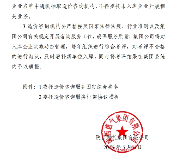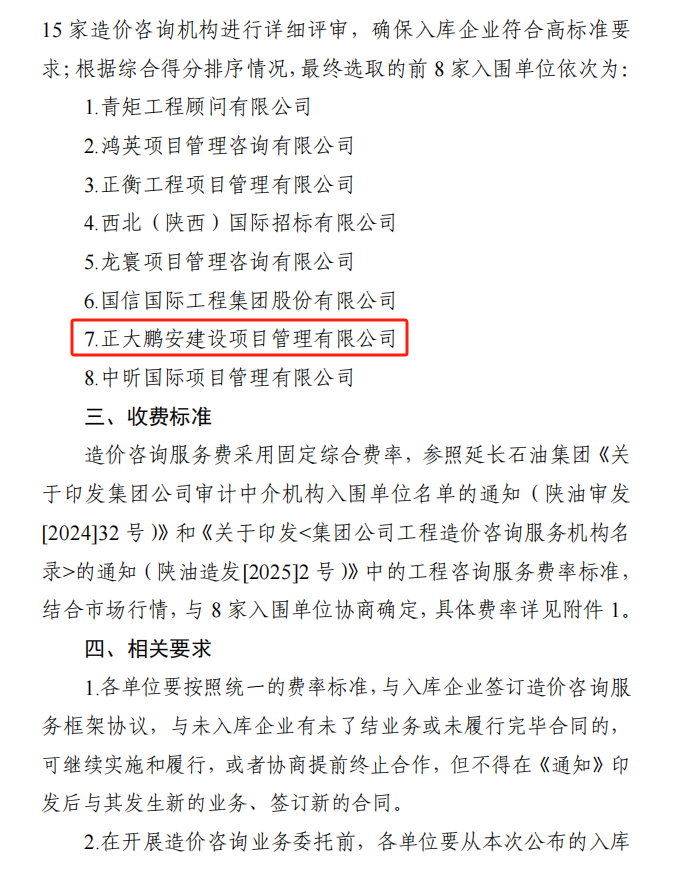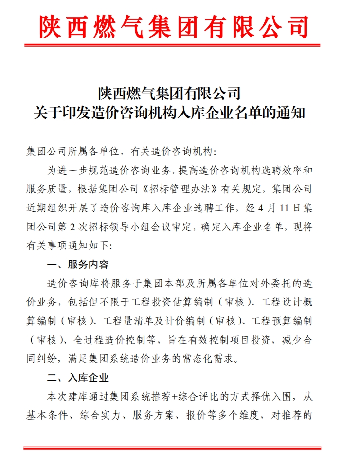 2025年4月11日,經(jīng)評(píng)標(biāo)委員會(huì)綜合評(píng)審,招標(biāo)人確認(rèn),正大鵬安建設(shè)項(xiàng)目管理有限公司入圍陜西燃?xì)饧瘓F(tuán)有限公司造價(jià)咨詢庫入庫企業(yè)選聘項(xiàng)目。