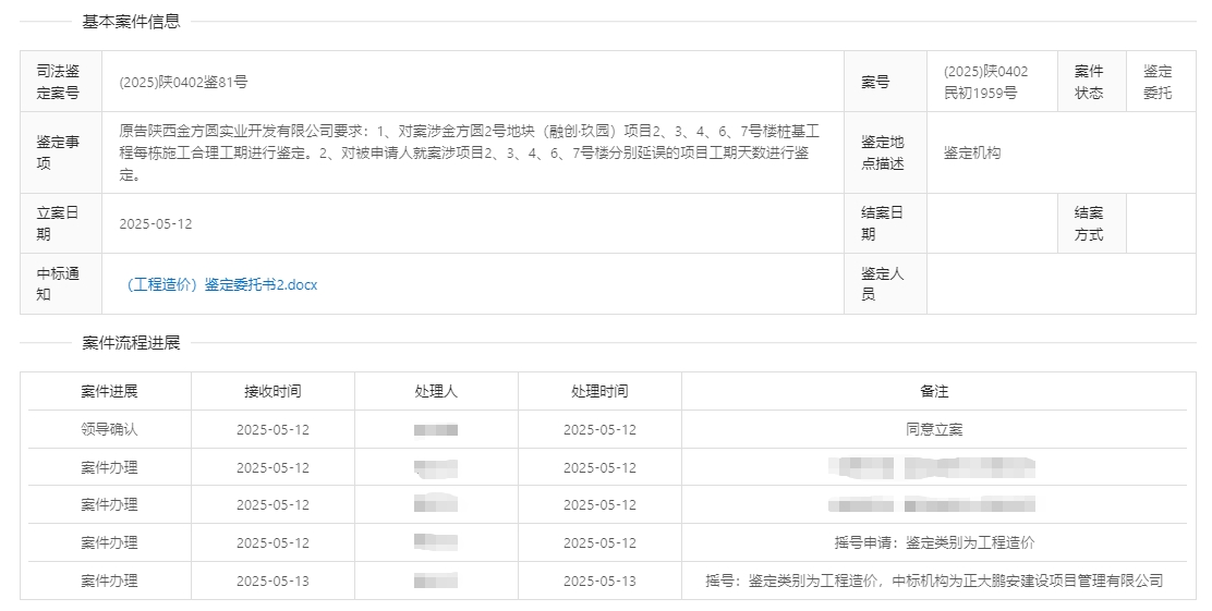 2025年5月12日,經(jīng)咸陽市秦都區(qū)人民法院確認,正大鵬安建設(shè)項目管理有限公司中標“原告陜西金方圓實業(yè)開發(fā)有限公司與被告陜西建工基礎(chǔ)工程集團有限公司關(guān)于施工合同糾紛一案”造價司法鑒定項目。