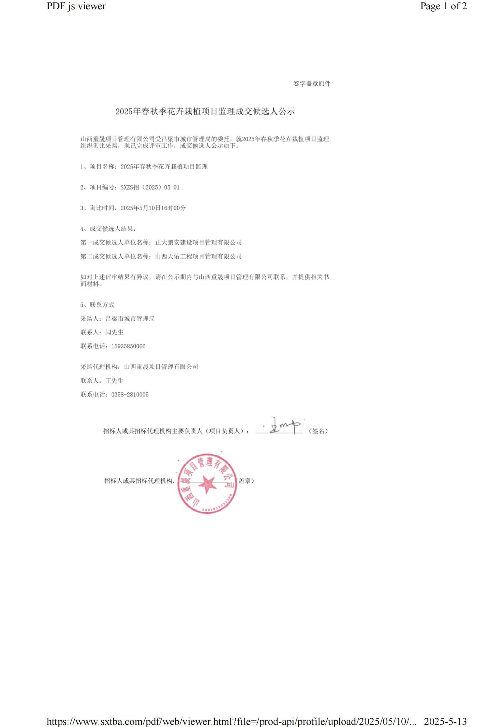 2025年5月10日,經評標委員會綜合評審,招標人確認,正大鵬安中標山西省呂梁市2025年春秋季花卉栽植項目監(jiān)理。
