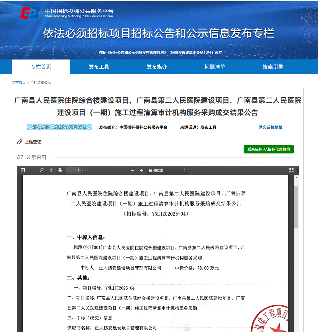 2025年5月7日,經(jīng)評(píng)標(biāo)委員會(huì)綜合評(píng)審,招標(biāo)人確認(rèn),正大鵬安建設(shè)項(xiàng)目管理有限公司中標(biāo)廣南縣人民醫(yī)院住院綜合樓建設(shè)項(xiàng)目、廣南縣第二人民醫(yī)院建設(shè)項(xiàng)目、廣南縣第二人民醫(yī)院建設(shè)項(xiàng)目(一期)施工過(guò)程清算審計(jì)機(jī)構(gòu)服務(wù)項(xiàng)目。
