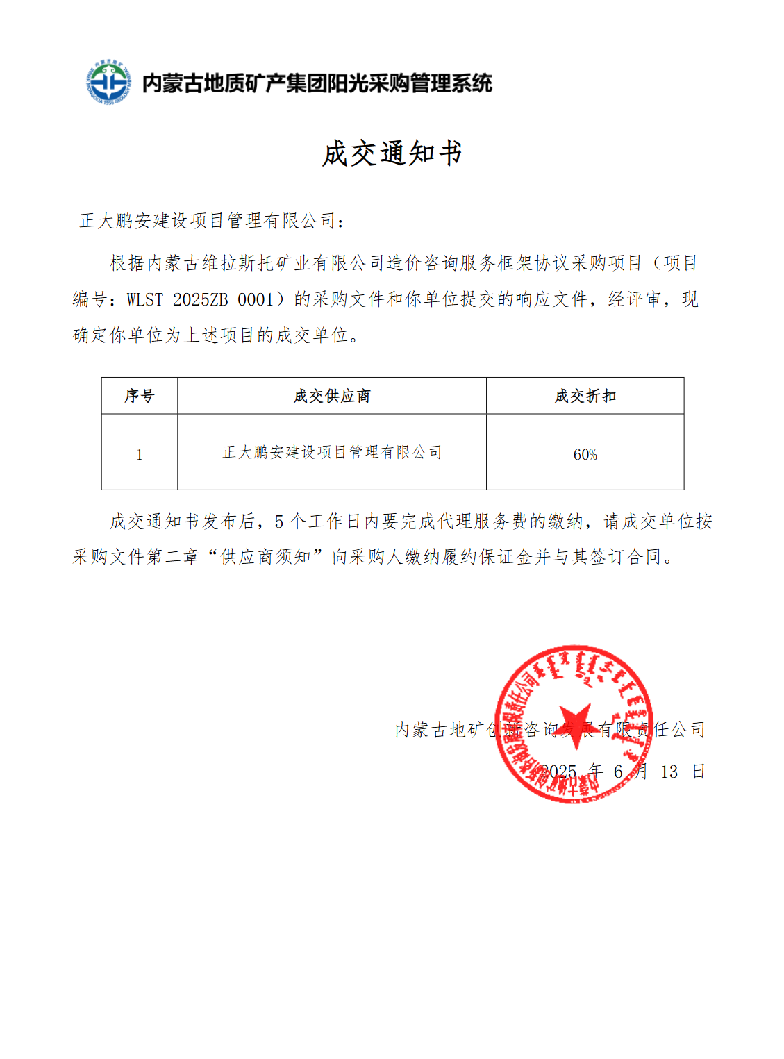 2025年6月7日,經(jīng)評標(biāo)委員會綜合評審,招標(biāo)人確認(rèn),正大鵬安建設(shè)項(xiàng)目管理有限公司入圍內(nèi)蒙古維拉斯托礦業(yè)有限公司造價(jià)咨詢服務(wù)框架協(xié)議采購項(xiàng)目。