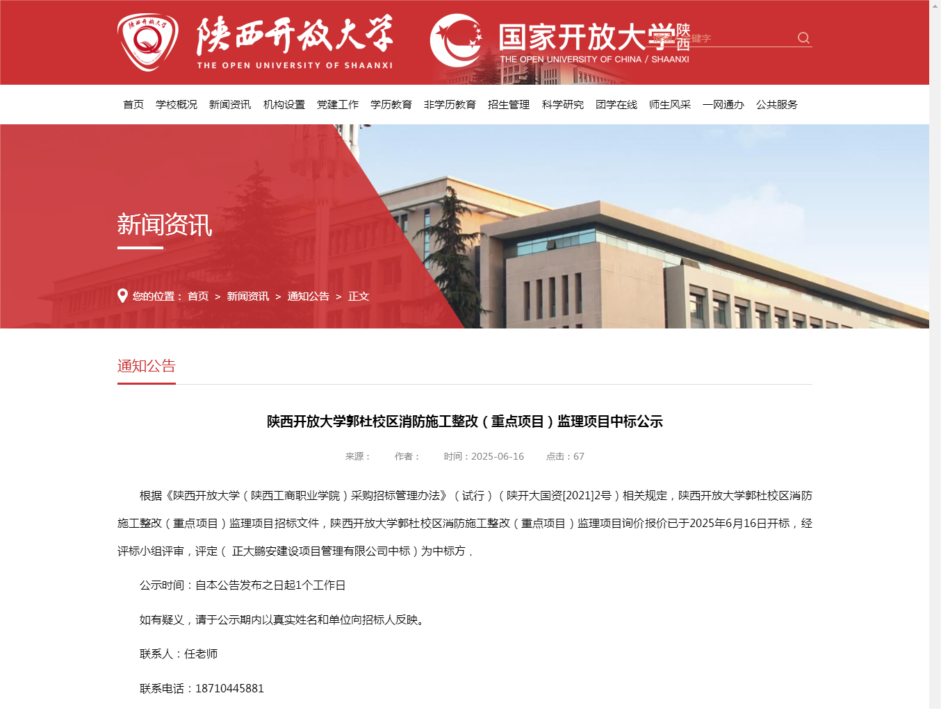 2025年6月16日,經(jīng)評(píng)標(biāo)委員會(huì)綜合評(píng)審,招標(biāo)人確認(rèn),正大鵬安中標(biāo)陜西開放大學(xué)郭杜校區(qū)消防施工整改(重點(diǎn)項(xiàng)目)監(jiān)理項(xiàng)目。
