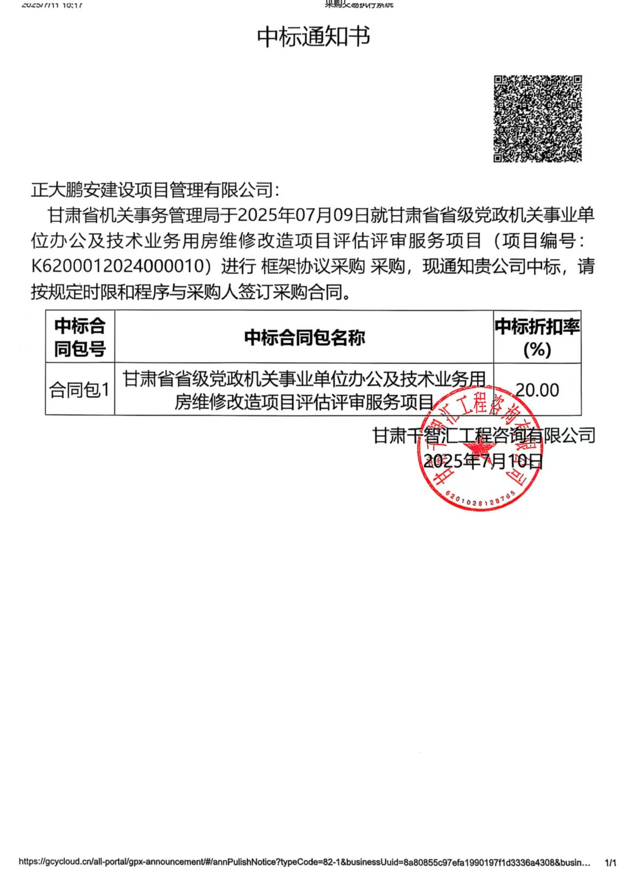 2025年7月10日,經(jīng)評標(biāo)委員會綜合評審,招標(biāo)人確認(rèn),正大鵬安建設(shè)項目管理有限公司中標(biāo)甘肅省省級黨政機(jī)關(guān)事業(yè)單位辦公及技術(shù)業(yè)務(wù)用房維修改造項目評估評審服務(wù)項目。