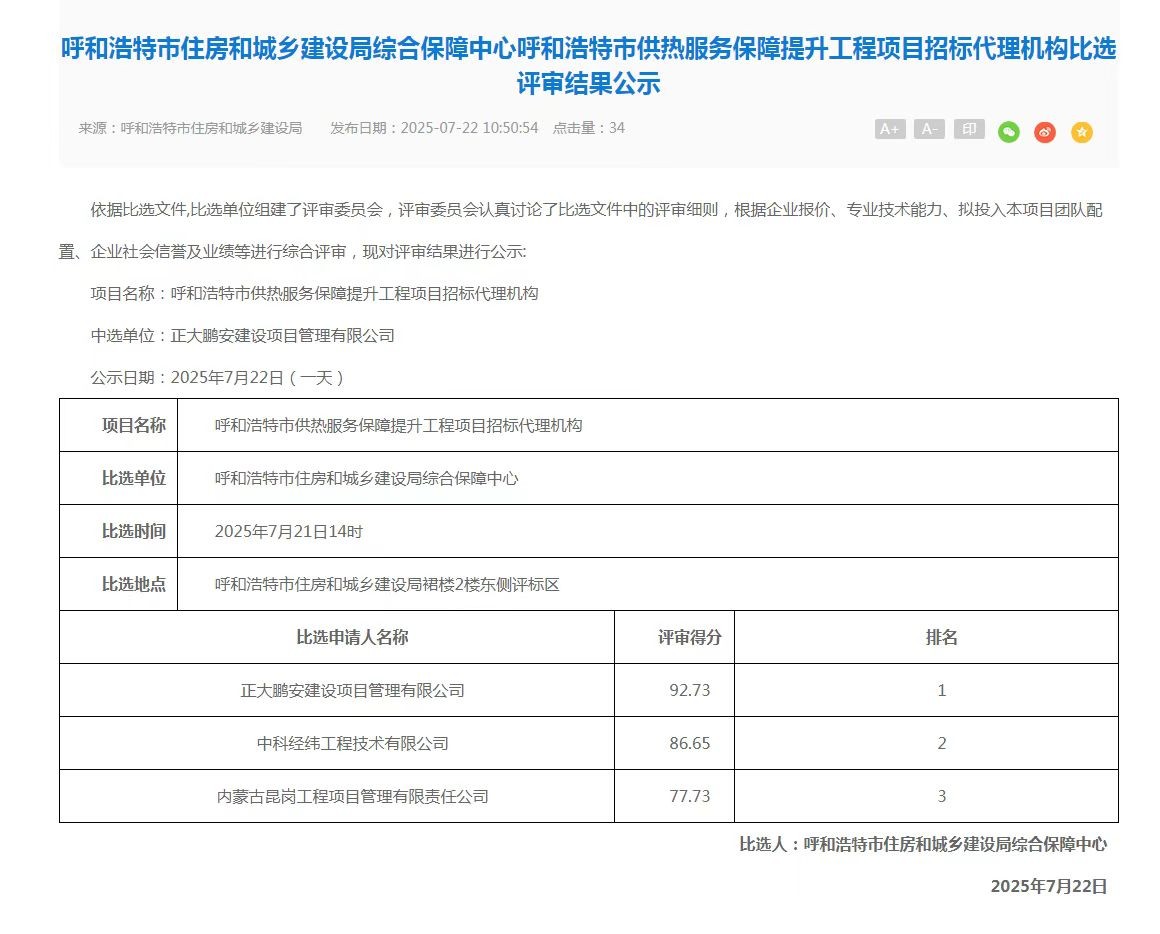 2025年7月22日,經(jīng)評(píng)標(biāo)委員會(huì)綜合評(píng)審,招標(biāo)人確認(rèn),正大鵬安建設(shè)項(xiàng)目管理有限公司中標(biāo)呼和浩特市供熱服務(wù)保障提升工程項(xiàng)目招標(biāo)代理機(jī)構(gòu)。