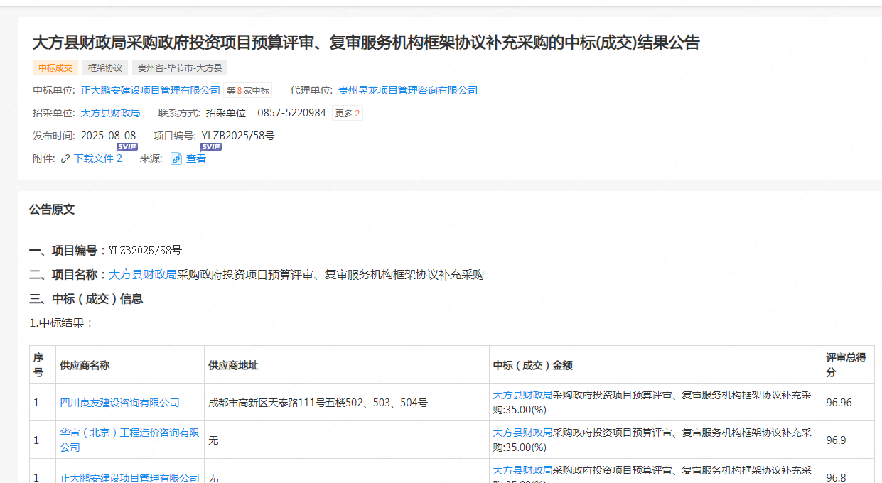 2025年8月8日,經(jīng)評標(biāo)委員會(huì)綜合評審,招標(biāo)人確認(rèn),正大鵬安建設(shè)項(xiàng)目管理有限公司中標(biāo)貴州省大方縣財(cái)政局采購政府投資項(xiàng)目預(yù)算評審、復(fù)審服務(wù)機(jī)構(gòu)框架協(xié)議補(bǔ)充采購項(xiàng)目。