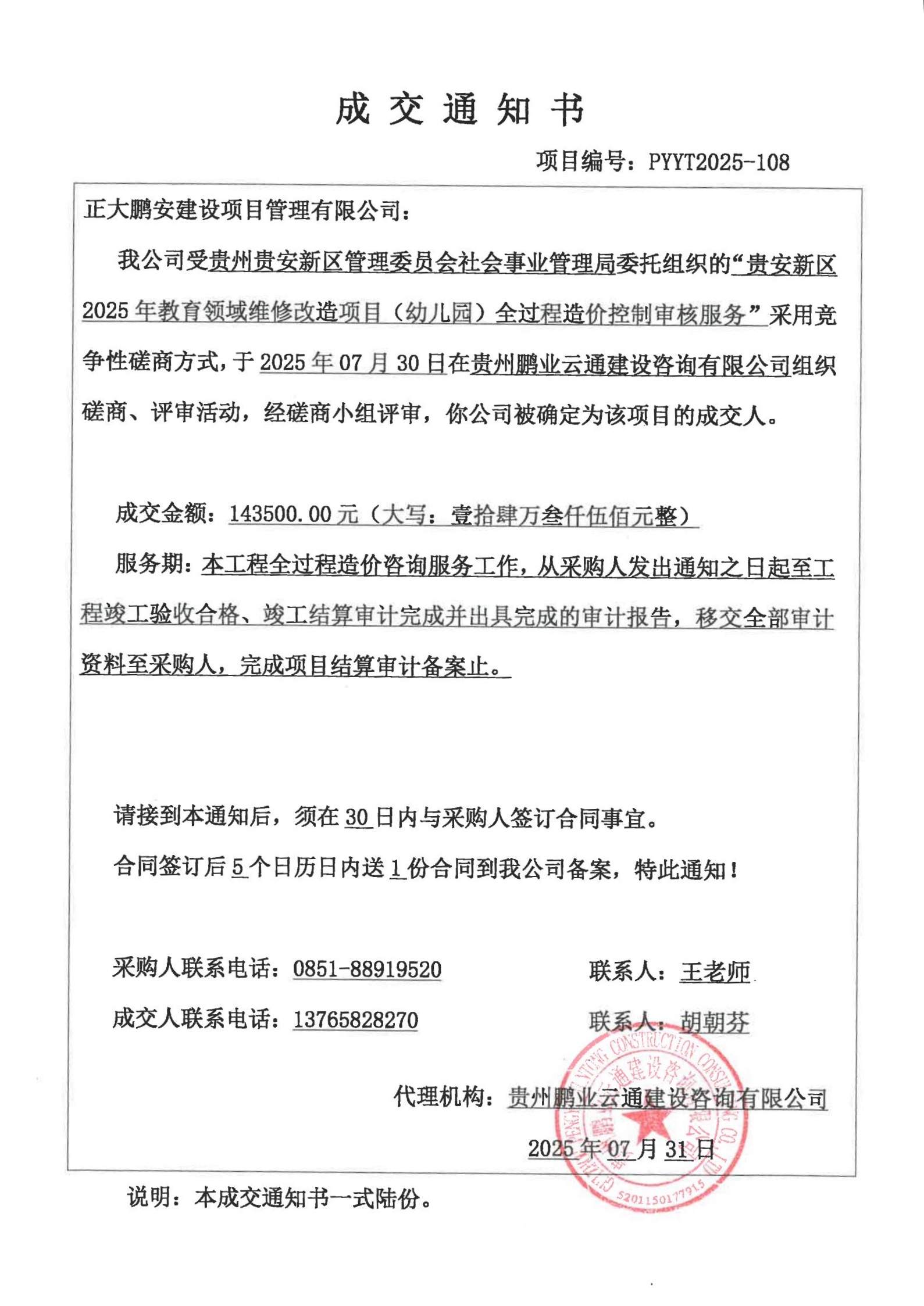 正大鵬安中標(biāo)貴州省貴安新區(qū)2025年教育領(lǐng)域維修改造項(xiàng)目(幼兒園)全過程造價(jià)控制審核服務(wù)