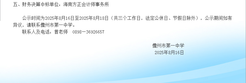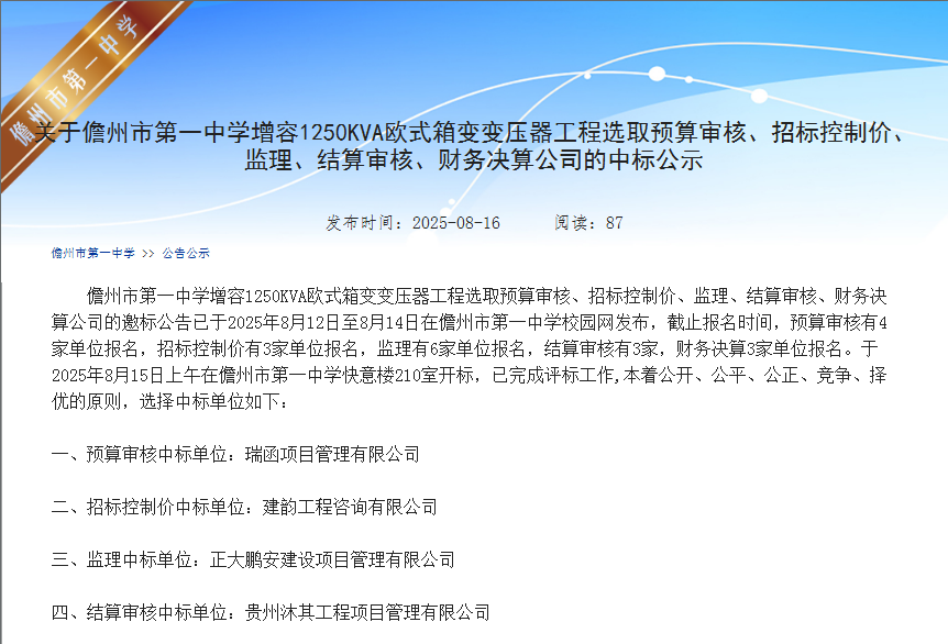 2025年8月16日,經(jīng)評標委員會綜合評審,招標人確認,正大鵬安中標儋州市第一中學增容1250KVA歐式箱變變壓器工程-監(jiān)理。